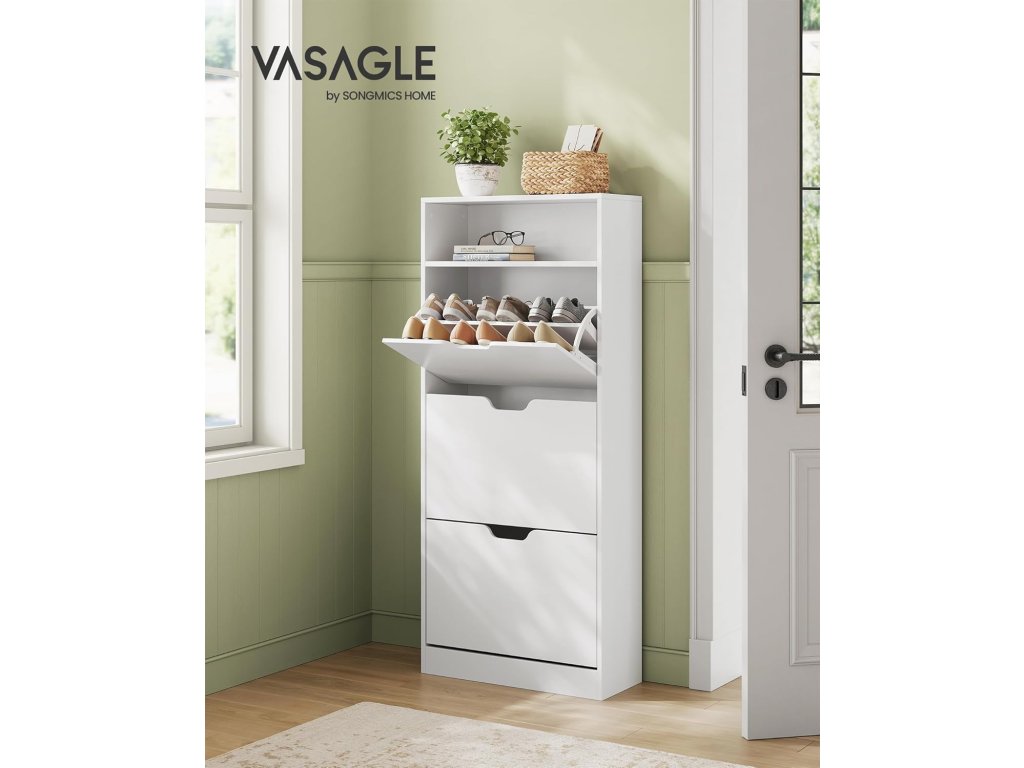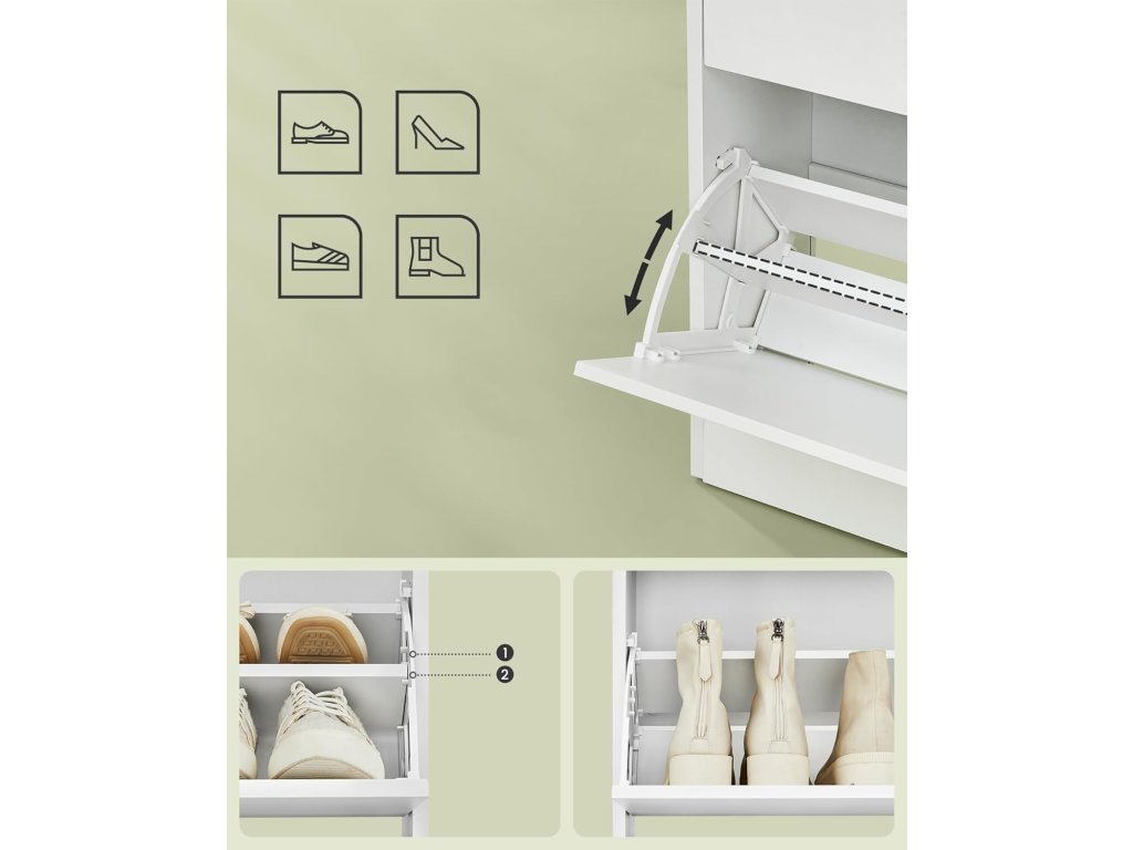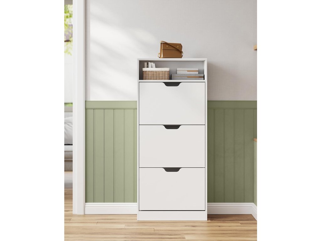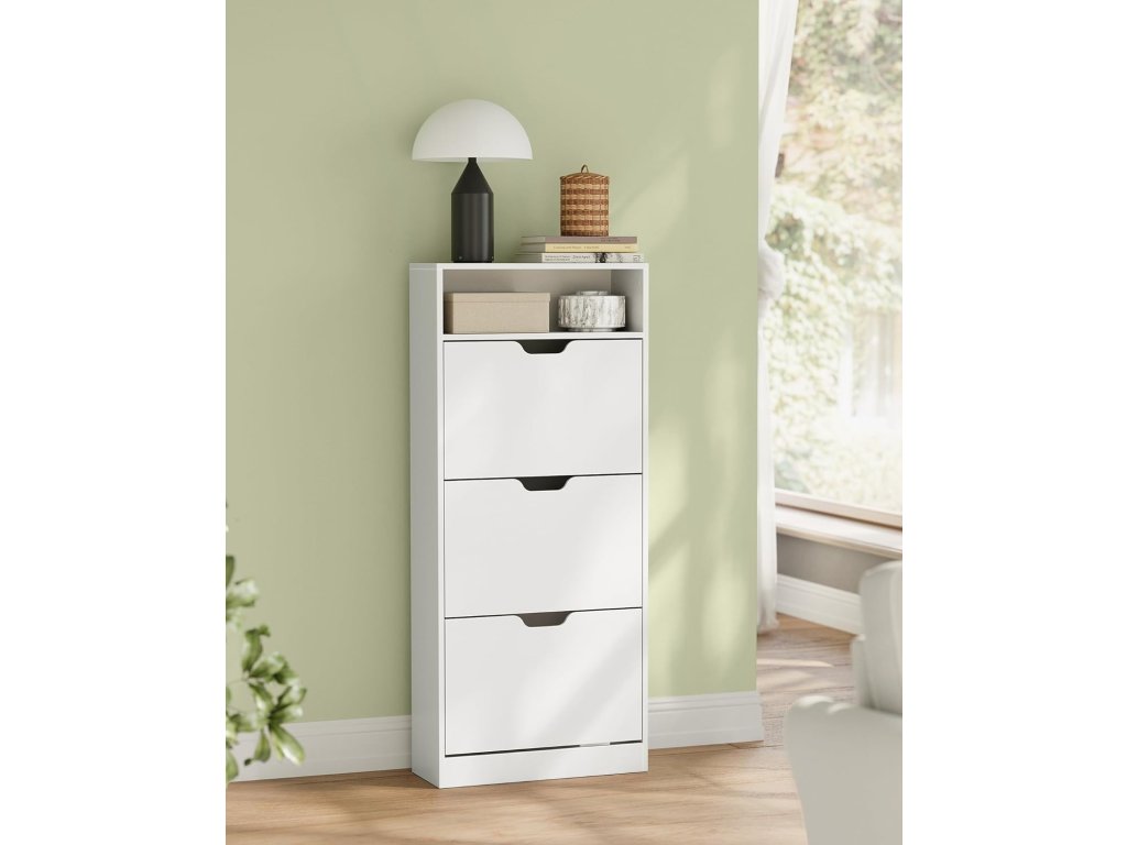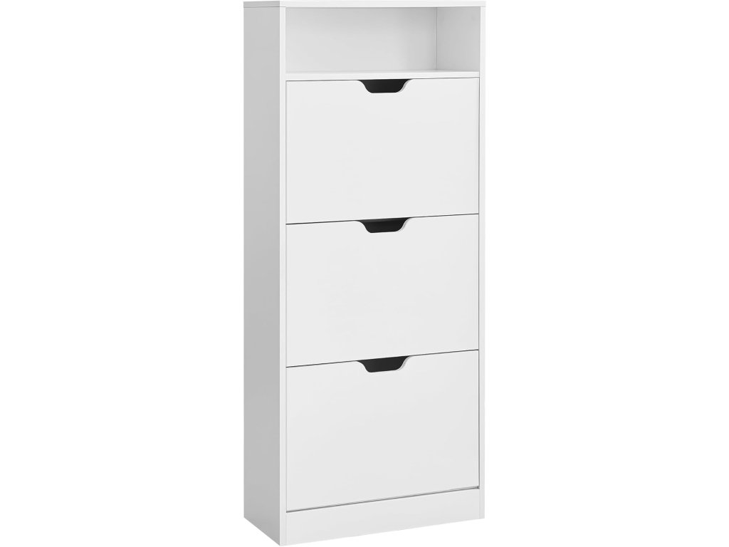 Botník se 3 výklopnými dvířky, otevřená přihrádka, nastavitelná přepážka, 14 až 18 párů, pro malé předsíně, 24 x 60 x 139 cm, bílá.