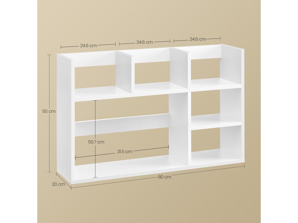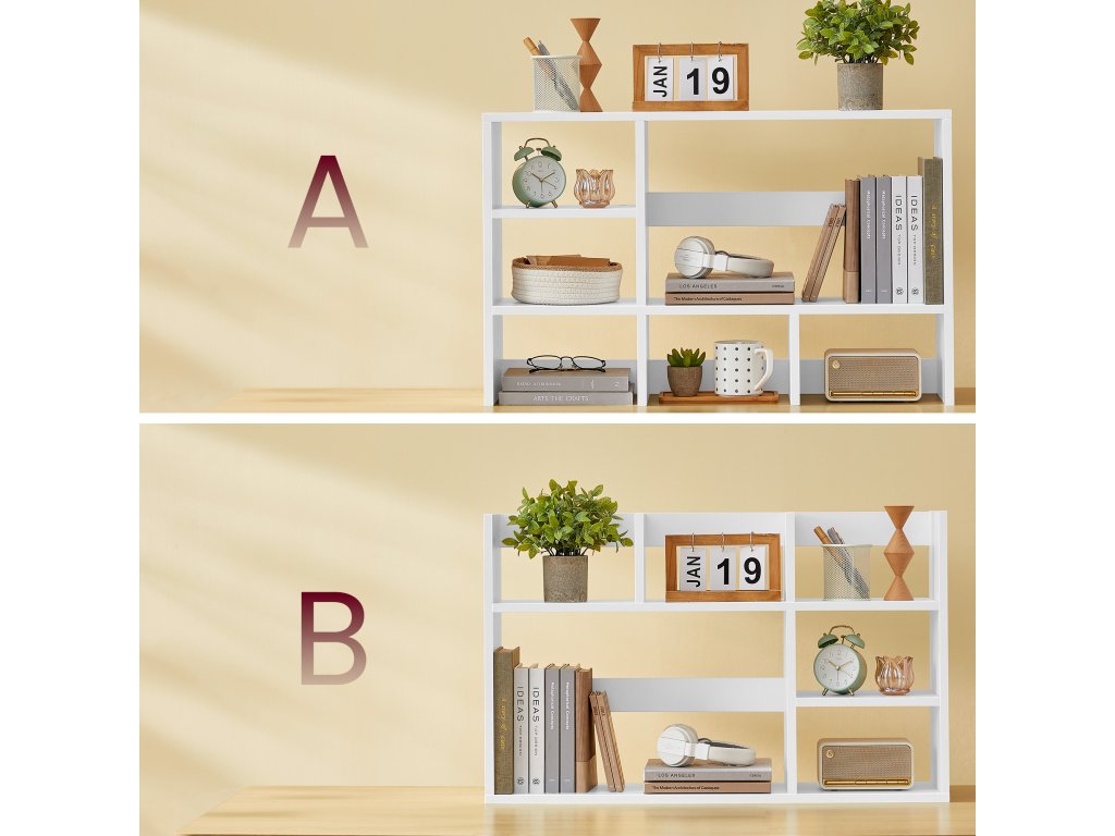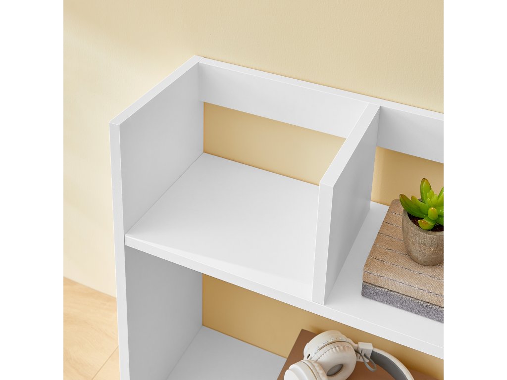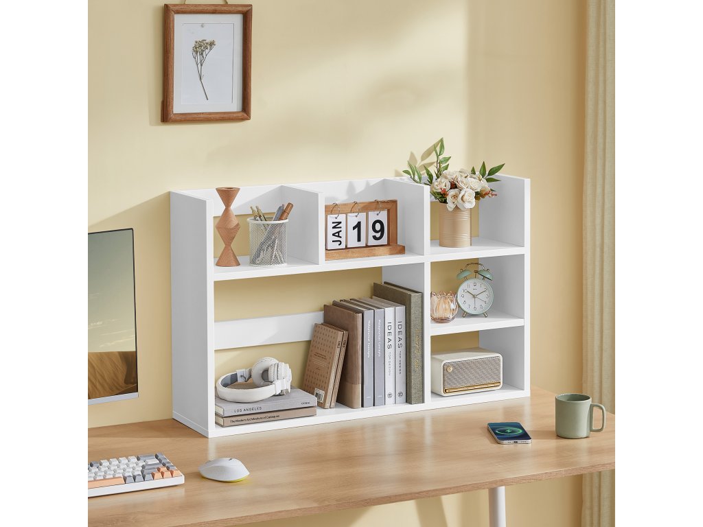 Dřevěný stolní úložný regál se 6 policemi pro počítačový stůl v moderní bílé barvě.