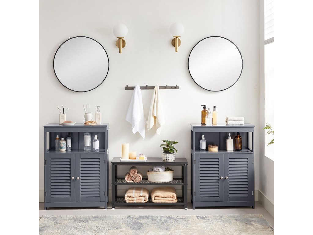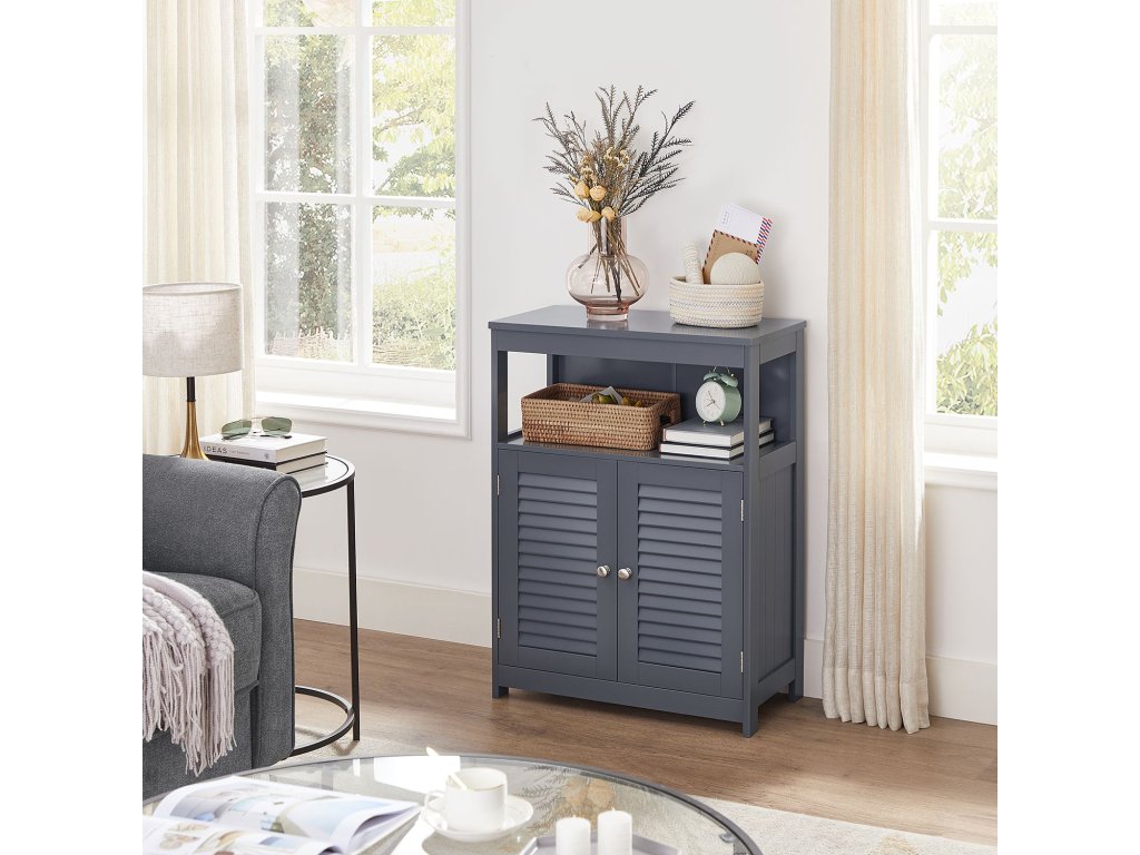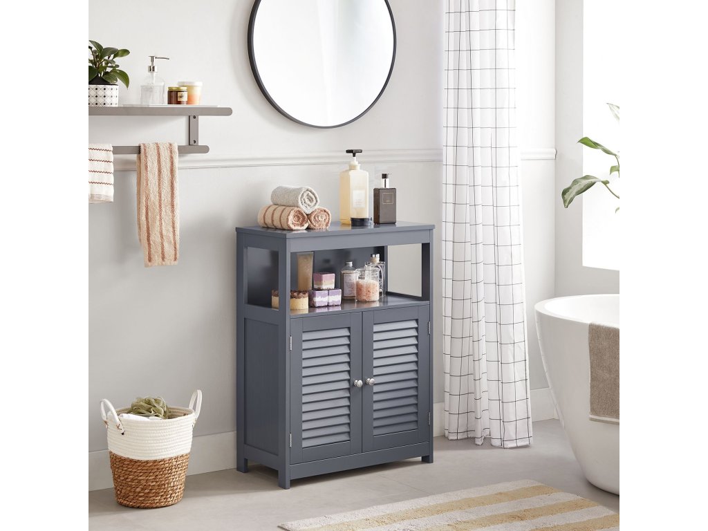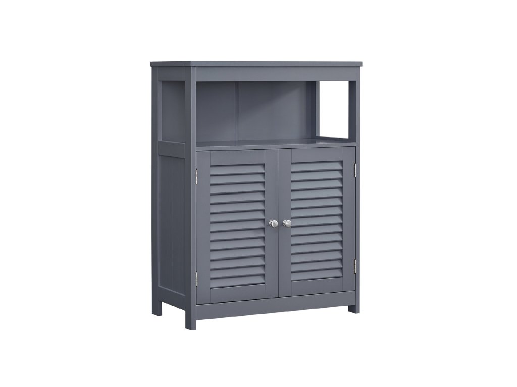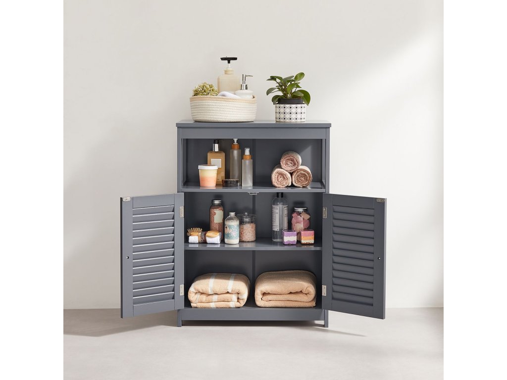Dřevěná podlahová skříňka do koupelny s organizérem, volně stojící kuchyňská skříňka, s dvojitými zavíracími dveřmi, šedá.