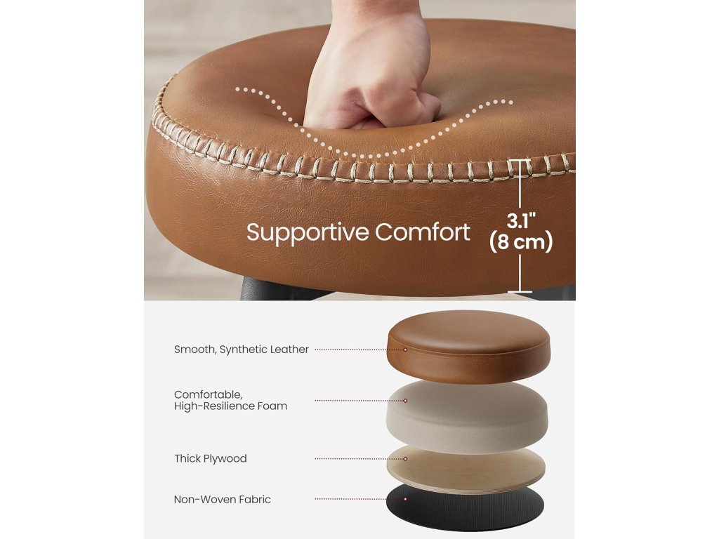 Vylepšete svůj prostor Sledujte svůdnou kombinaci umělé kůže, rafinovaného prošívání a elegantních kuželových nohou u těchto barových židlí z kolekce ECHO, které jsou hmatatelnou poctou duchu řemeslného zpracování a povznesou váš domov do nových výšin sofistikovanosti. Pohodlí všude: Po hladkém potahu přejeďte rukou a pak si vychutnejte podpůrný luxus 3,1 palce silné vysoce pružné pěny. Tyto barové židle poskytují pohodlné sezení, které vydrží a projde zkouškou času. [Přizpůsobivá elegance] Tato sada 2 barových židlí s jedinečnými stupňovitými opěrkami nohou je nejnovějším objevem, který mění pravidla hry. Bez námahy se přizpůsobí přátelům všech výšek a nabízejí bezkonkurenční kombinaci pohodlí a všestrannosti. Stabilní stabilita, hladký chod na podlaze: Díky otočným vyrovnávacím nohám zajišťují tyto kuchyňské stoličky stabilitu na nerovném povrchu a hladký kontakt bez poškrábání, což vnáší klid do klidného popíjení nebo živých večírků. [Čistota bez námahy a elegance: Občasné rozlití tekutin? Nebojte se! Voděodolný potah ze syntetické kůže, který lze vyčistit během okamžiku. Matné ocelové nohy jsou odolné proti poškrábání a zachovávají si svůj sofistikovaný půvab i při každodenním používání.| Kategorie: | Barové židle |