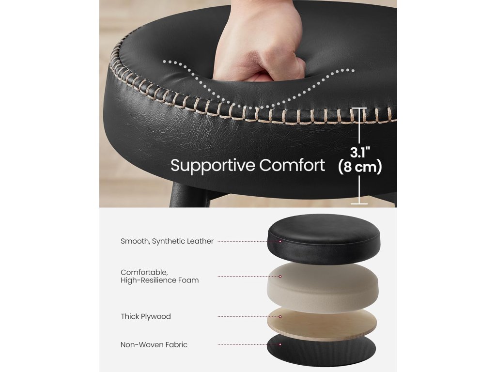 Vylepšete svůj prostor Sledujte svůdnou kombinaci umělé kůže, rafinovaného prošívání a elegantních kuželových nohou u těchto barových židlí z kolekce ECHO, které jsou hmatatelnou poctou duchu řemeslného zpracování a povznesou váš domov do nových výšin sofistikovanosti. Pohodlí všude: Po hladkém potahu přejeďte rukou a pak si vychutnejte podpůrný luxus 3,1 palce silné vysoce pružné pěny. Tyto barové židle poskytují pohodlné sezení, které vydrží a projde zkouškou času. [Přizpůsobivá elegance] Tato sada 2 barových židlí s jedinečnými stupňovitými opěrkami nohou je nejnovějším objevem, který mění pravidla hry. Bez námahy se přizpůsobí přátelům všech výšek a nabízejí bezkonkurenční kombinaci pohodlí a všestrannosti. Stabilní stabilita, hladký chod na podlaze: Díky otočným vyrovnávacím nohám zajišťují tyto kuchyňské stoličky stabilitu na nerovném povrchu a hladký kontakt bez poškrábání, což vnáší klid do klidného popíjení nebo živých večírků. [Čistota bez námahy a elegance: Občasné rozlití tekutin? Nebojte se! Voděodolný potah ze syntetické kůže, který lze vyčistit během okamžiku. Matné ocelové nohy jsou odolné proti poškrábání a zachovávají si svůj sofistikovaný půvab i při každodenním používání.| Kategorie: | Barové židle |