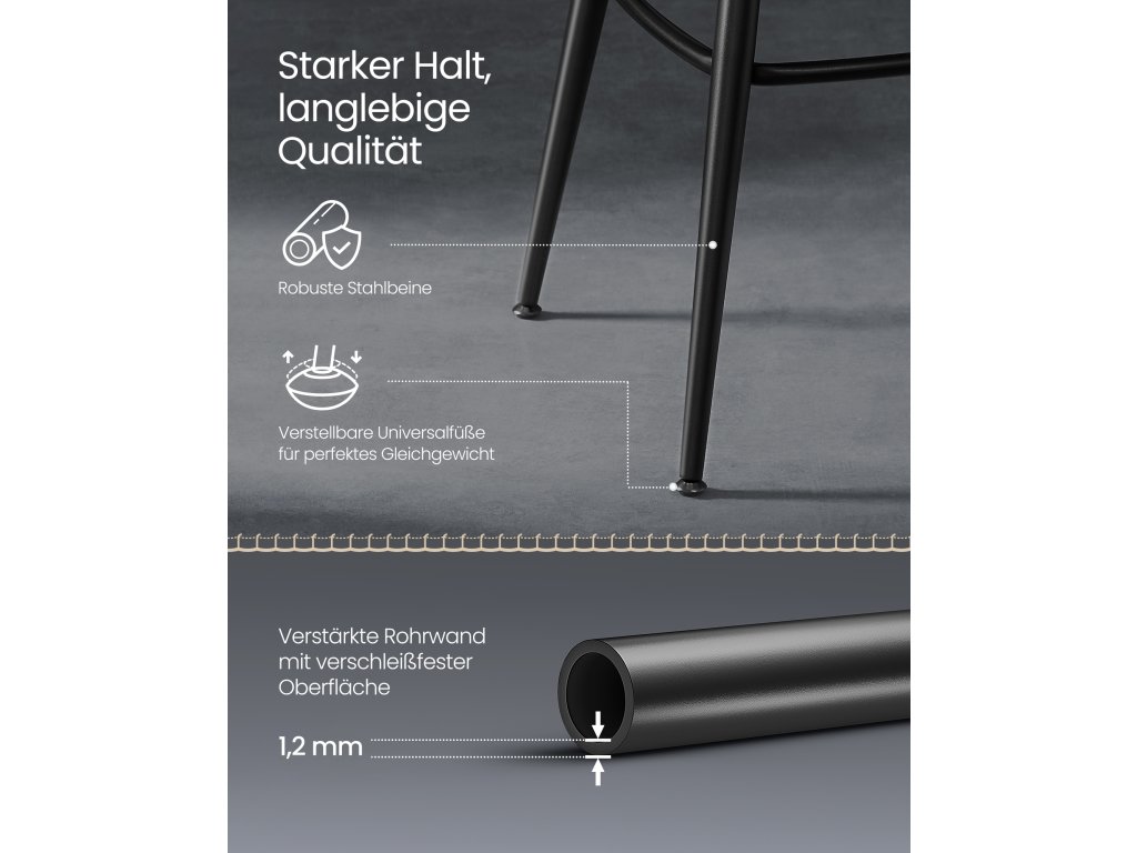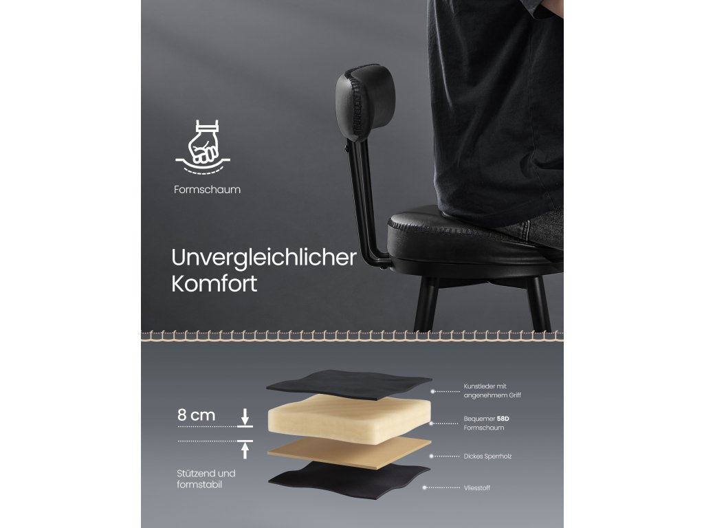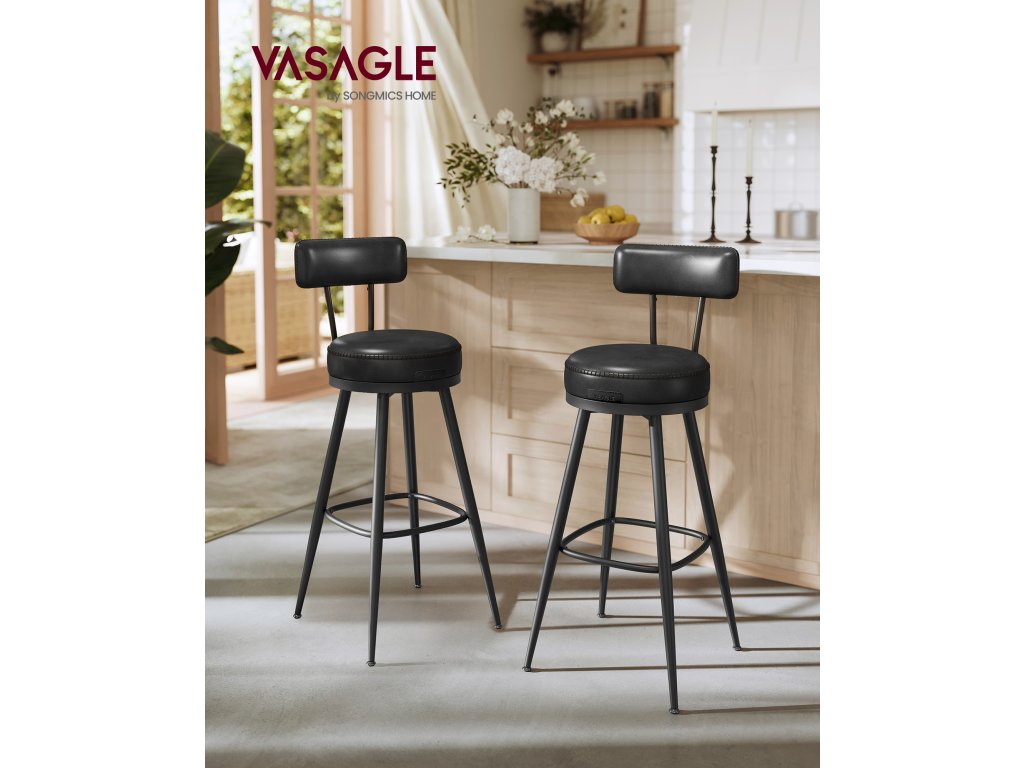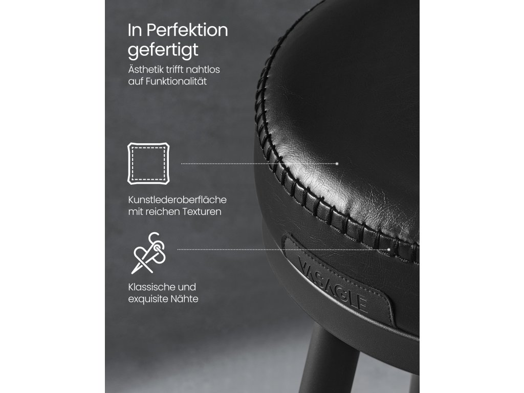 Oživte svůj prostor Tato barová židle z kolekce VASAGLE EKHO je potažena umělou kůží s bohatou texturou a jemné prošívání svědčí o řemeslném zpracování a vytváří domov, který vypovídá o vašem stylu. Pohodlí při každém usednutí: Přes hladký potah přejeďte rukou a zabořte se do 8 cm silné tvarované pěny 58D. Tyto barové židle poskytují pohodlné sezení, které obstojí ve zkoušce času. Stabilní a šetrné k podlaze: Navenek stojící kovové nohy, které tvoří pevnou základnu, spolu s nastavitelnými univerzálními nožkami poskytují těmto židlím nejen vysokou stabilitu na nerovných podlahách, ale také chrání podlahu před poškrábáním. [Otočný sedák, volná interakce] Barové stoličky otočné o 360° se volně otáčejí, abyste se dostali do kontaktu se všemi kolem vás. Každá společenská událost - ať už v kuchyni, domácím baru nebo zábavním pokoji - se tak stane hitem! [Snadná péče, trvalý půvab] Něco se rozlilo? Žádný problém! Díky našemu voděodolnému potahu z umělé kůže je čištění hračka. Spolu s matnými ocelovými nohami odolnými proti poškrábání si naše stoličky zachovají svůj kvalitní půvab po dlouhou dobu.