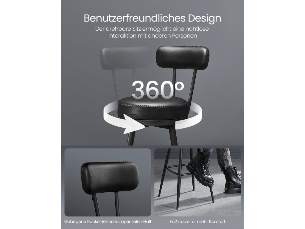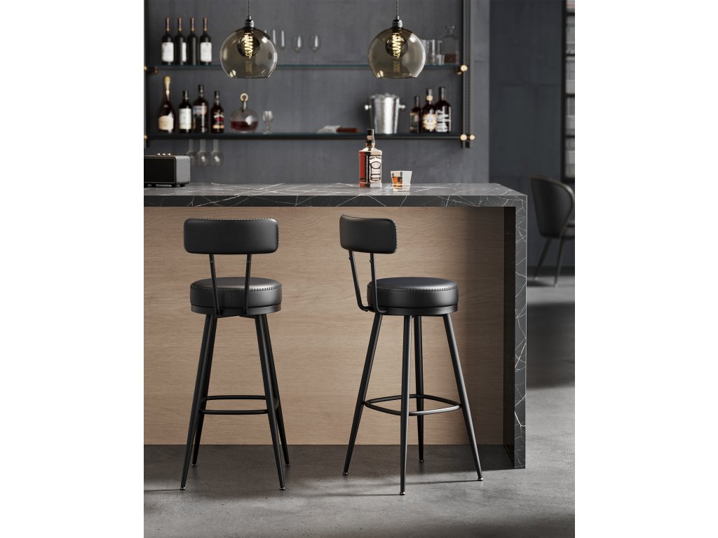 360° otočné barové stoličky, sada 2 stoliček s opěradlem pro barový stůl, umělá kůže s prošíváním v černé barvě.
