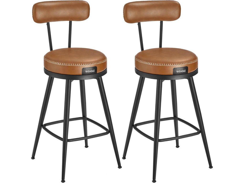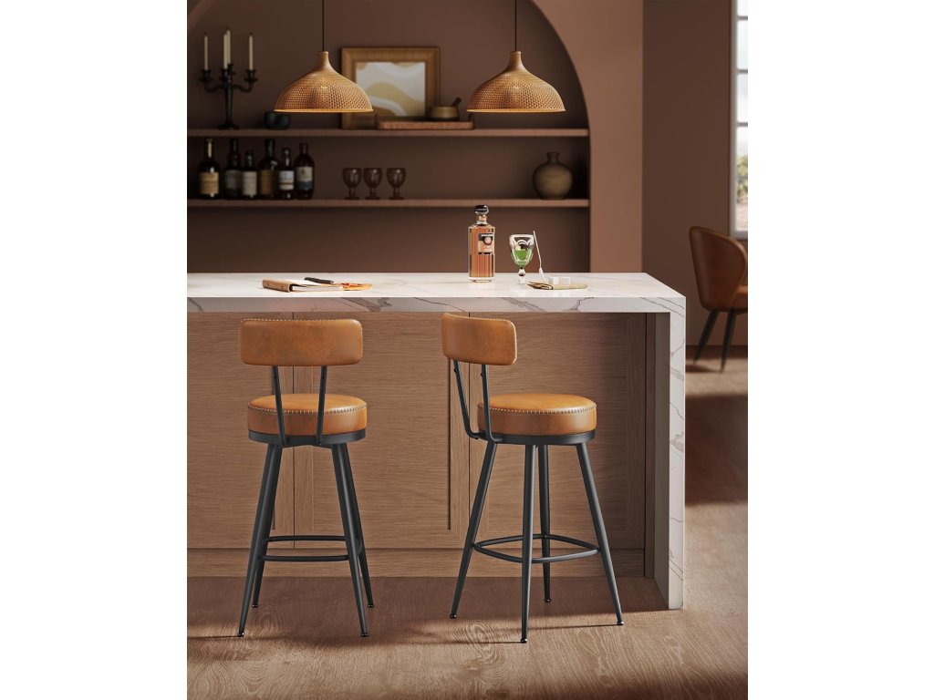 Otočné barové židle sada 2, barové židle s opěradlem, syntetická kůže s prošíváním, moderní v polovině století, výška 25,6 palce, kuchyňský bar, karamelově hnědý.