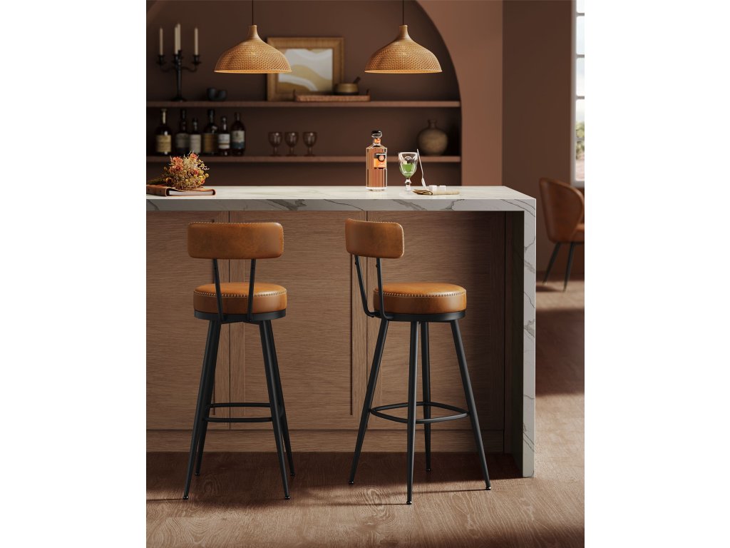 Sada 2 otočných barových židlí s opěradlem, umělá kůže s prošíváním, moderní styl poloviny století, 76 cm vysoký kuchyňský bar, karamelově hnědá,