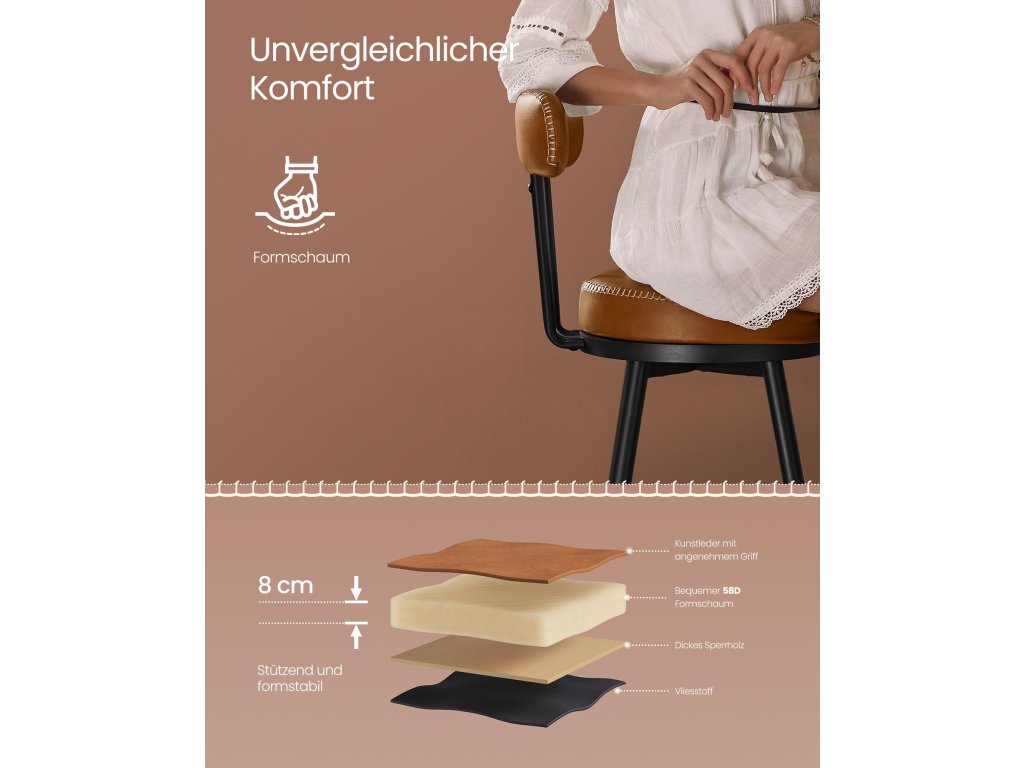 Vylepšete svůj prostor Naše barové židle z kolekce VASAGLE EKHO jsou svůdnou kombinací umělé kůže a kůže z umělé kůže. jemné prošívání a zúžené nohy, které ctí řemeslo a povýší váš domov na novou úroveň sofistikovanosti.Pohodlí při každém usednutí Přejeďte rukou po hladkém potahu a zabořte se do 8 cm silné tvarované pěny 58D. Tyto barové židle poskytují pohodlné sezení, které obstojí ve zkoušce času.Stabilní a šetrné k podlaze Ven vyčnívající kovové nohy, které tvoří pevnou základnu, spolu s nastavitelnými univerzálními nožičkami zajišťují těmto stoličkám nejen vysokou stabilitu na nerovných podlahách, ale i stabilitu na podlaze. ale také chrání podlahu před poškrábánímOtočné sedadlo, volná interakce Barové stoličky otočné o 360° se volně otáčejí, abyste mohli být v kontaktu se všemi kolem vás. Každá společenská událost - ať už v kuchyni, domácím baru nebo zábavním pokoji - se tak stane hitem!.Snadná péče, trvalý půvab Něco se vylilo? Žádný problém! Díky našemu voděodolnému potahu z umělé kůže je čištění hračka. Spolu s matnými ocelovými nohami odolnými proti poškrábání si naše stoličky zachovají svůj kvalitní půvab po dlouhou dobu.| Kategorie: | Barové židle |