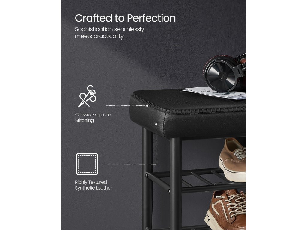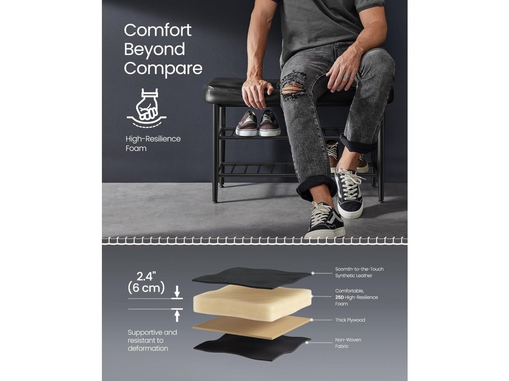 Pohodlí při každém sezení Přejeďte přes hladký potah a pak se zabořte do 8 cm silné, vysoce pružné pěny 25D, která se nikdy nedeformuje. Tato lavice nabízí skvělé sezení, které odolá času.Silná a stabilní Díky robustnímu ocelovému rámu a nastavitelným univerzálním nohám tato polstrovaná lavice na boty snadno unese až 135 kg. Nabízí pevné a stabilní držení a je ideální na začátek nebo konec dne.Extra úložný prostor, bezpečný pro vysavač Spodní police je 10 cm nad zemí a má 3 úrovně pro uložení bot. Navíc je dostatečně vysoká pro robotické vysavače, abyste měli v pokoji pořádek a čistotu.Zkrášlí váš pokoj V kolekci EKHO od VASAGLE se sedací souprava setkává s umělou kůží a jemnými švy. Jeho jemné kontury zajišťují větší bezpečnost a dobře polstrovaný sedák zajišťuje dokonalou rovnováhu mezi napětím a plností.Snadná údržba, snadná montáž Tato lavice má potah z umělé kůže, který se snadno čistí. Díky přehledným pokynům a přiloženému montážnímu nářadí je montáž hračkou pro maximální pohodlí a komfort.| Kategorie: | Lavice do předsíně |