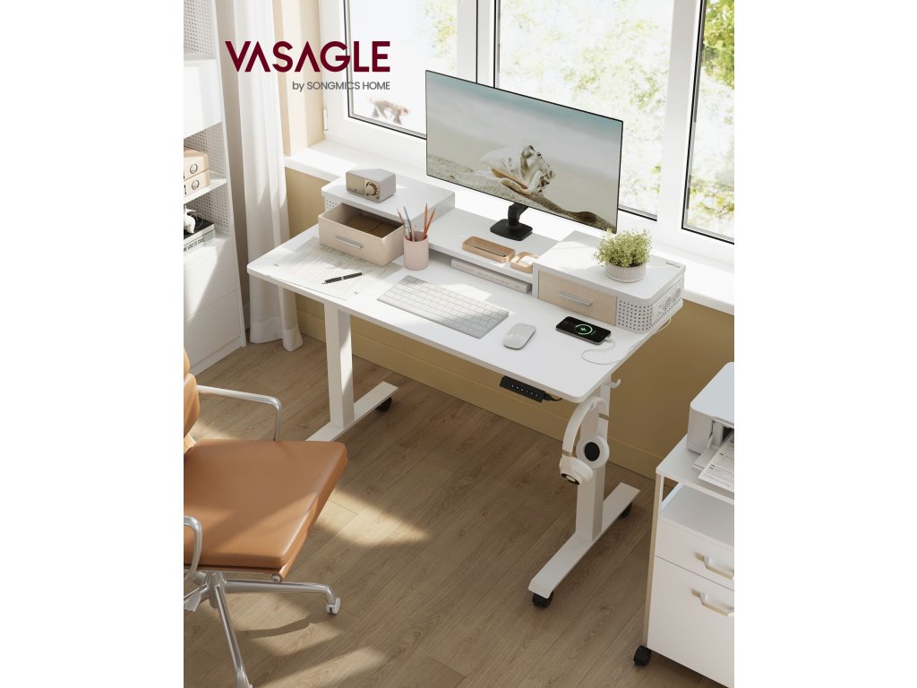 Elektrický výškově nastavitelný stůl, 60 x 120 x (72-120) cm, plynule nastavitelný, s podstavcem na monitor, háček, paměťová funkce, bílý.