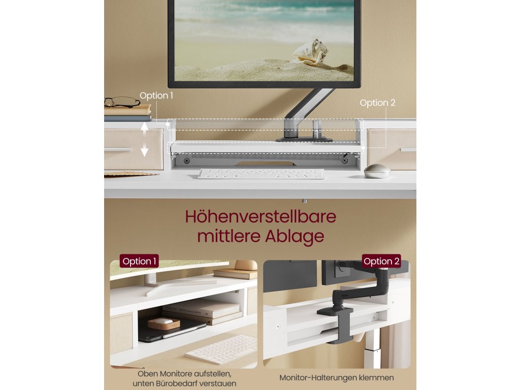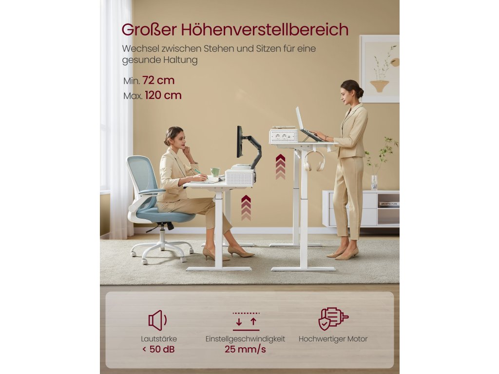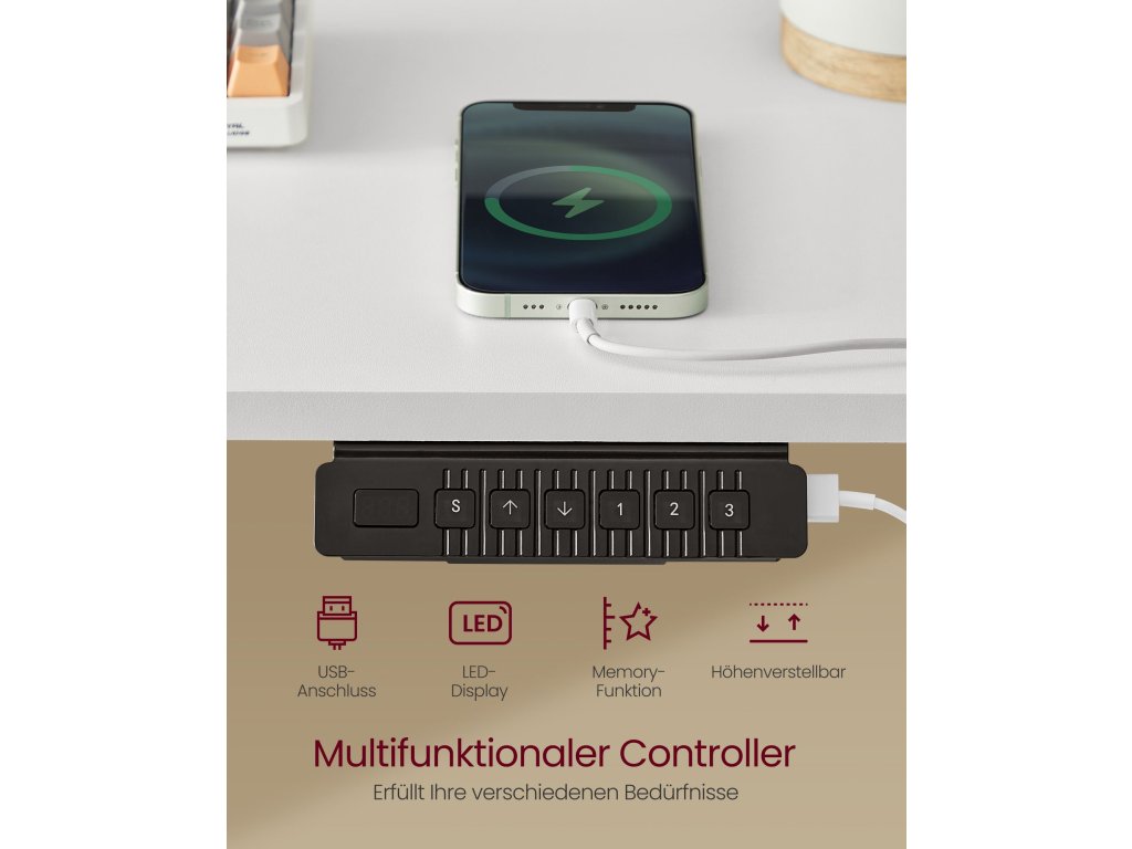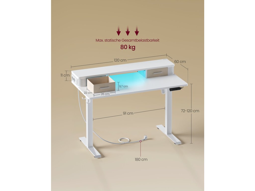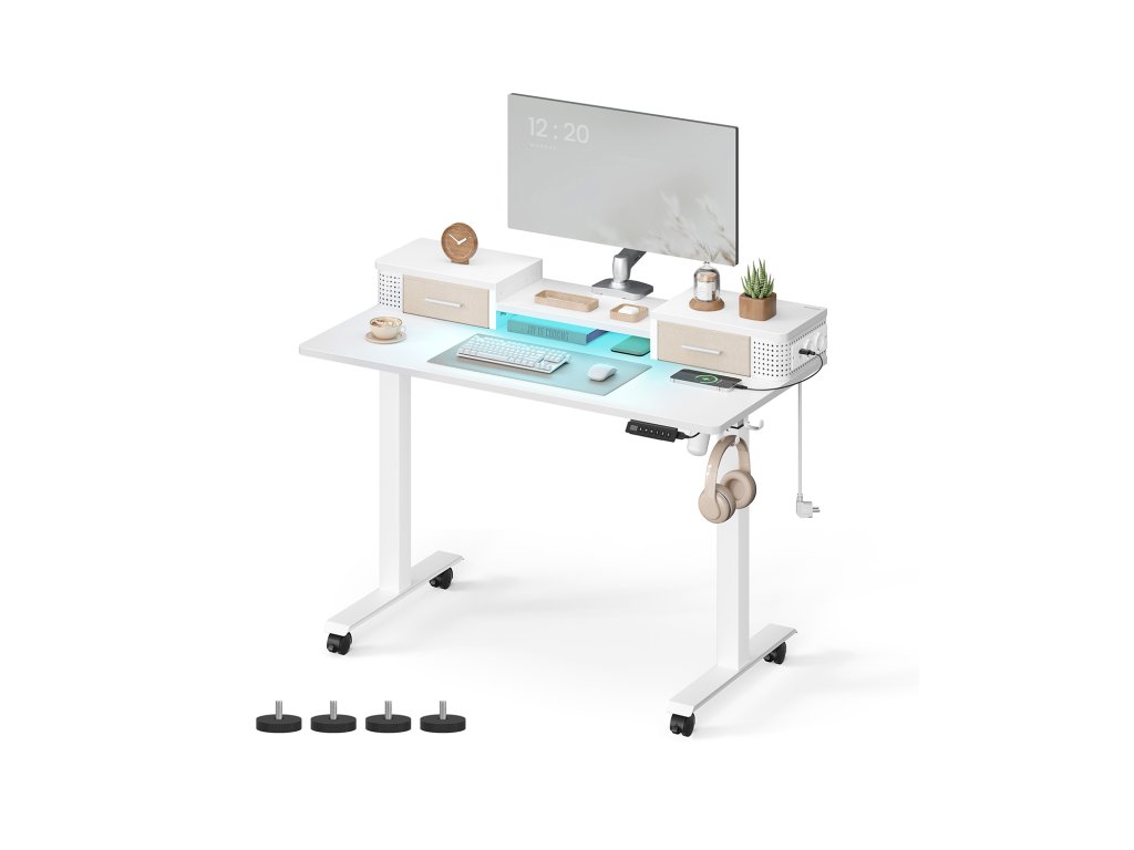 Nastavitelná výška a paměťová funkce Tento stůl je volně nastavitelný v rozmezí 72 až 120 cm. Vsedě nebo vestoje? Najděte si ideální polohu; Kromě toho lze uložit celkem 3 výšky pro rychlé nastavení;Recover, store, charge Středová police stojanu monitoru je výškově nastavitelná; na obou stranách jsou 2 zásuvky na drobné předměty; Perforované panely pro skrytí kabelů a 2 zásuvky AC a 2 porty USB pro nabíjení;Vysoce kvalitní motor Zajišťuje plynulé nastavení a nízkou hladinu hluku (<50 dB); Mechanismus pro nastavení výšky se při nárazu na překážku zastaví a mírně se stáhne, aby chránil pracovní plochu před poškozením.S háčkem a osvětlením Boční háček lze použít k zavěšení sluchátek pro snadný přístup; Přiložené nastavitelné LED osvětlení osvětlí váš pracovní prostor a zároveň zlepší atmosféru.Stabilní konstrukce Dvojitá podpůrná tyč dodává této stolové desce vysokou stabilitu - už žádné kmitání. Díky ocelovému rámu unese tento výškově nastavitelný stůl až 80 kg.| Kategorie: | Psací a pracovní stoly |