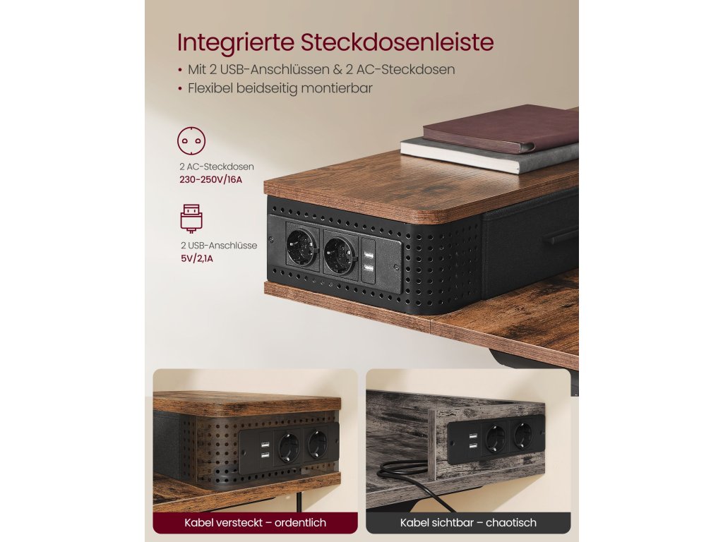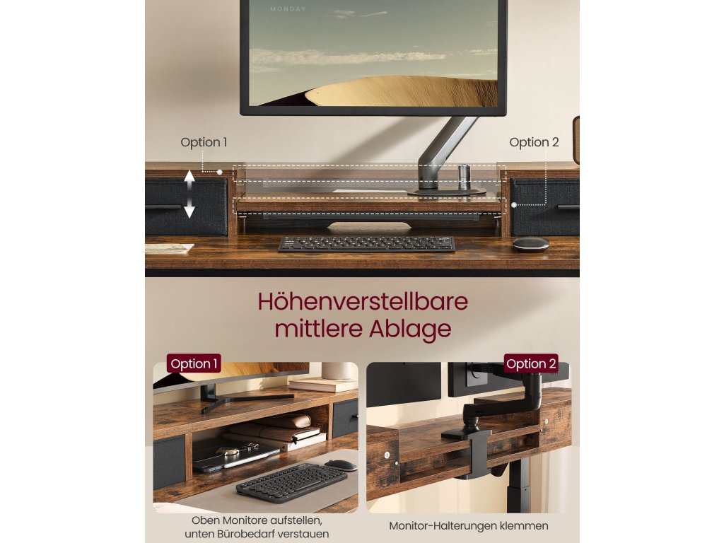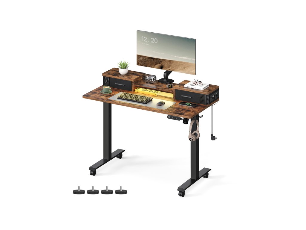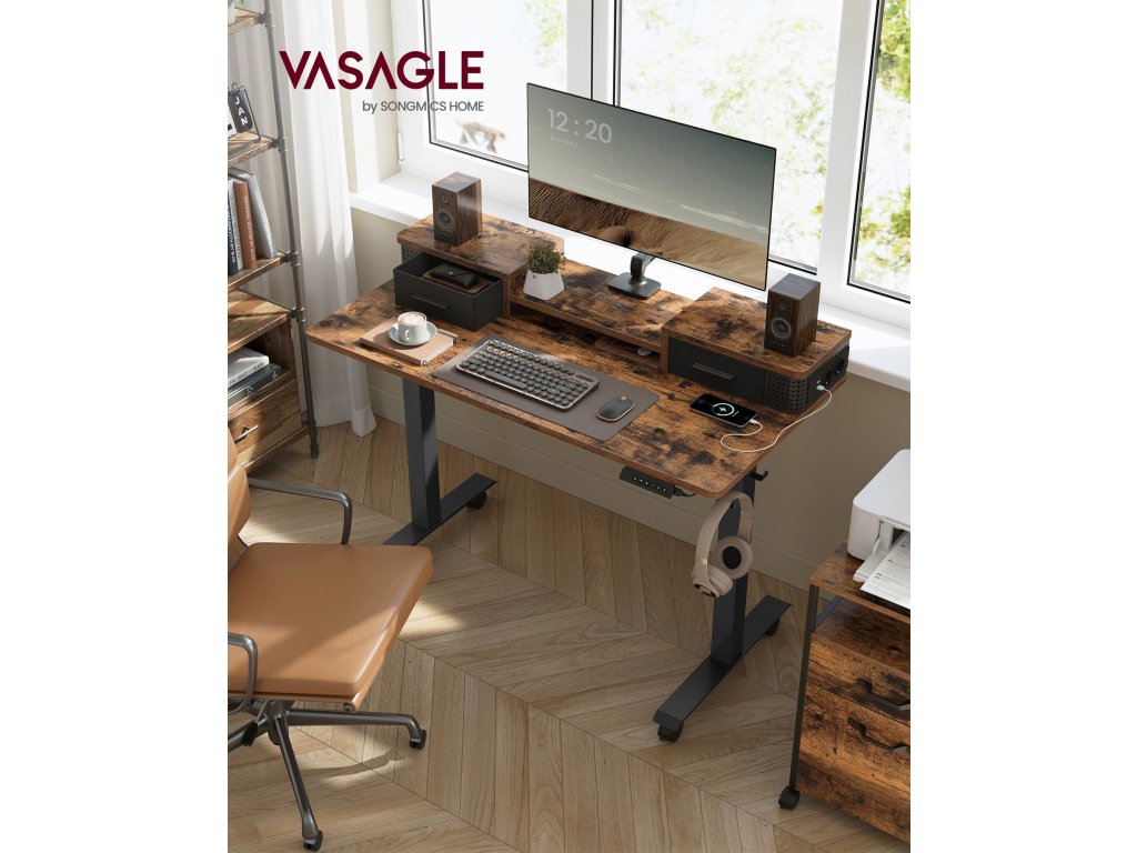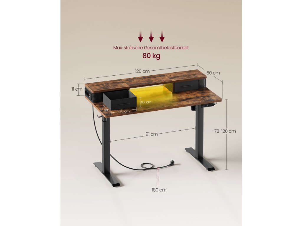 Elektrický výškově nastavitelný stůl, 60 x 120 x (72-120) cm, plynule nastavitelný, s podstavcem na monitor, háček, paměťová funkce, vintage hnědý.