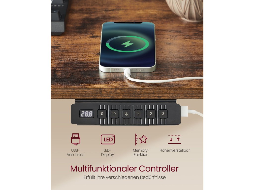 Nastavitelná výška a paměťová funkce Tento stůl je volně nastavitelný v rozmezí 72 až 120 cm. Vsedě nebo vestoje? Najděte si ideální polohu; Kromě toho lze uložit celkem 3 výšky pro rychlé nastavení;Recover, store, charge Středová police stojanu monitoru je výškově nastavitelná; na obou stranách jsou 2 zásuvky na drobné předměty; Perforované panely pro skrytí kabelů a 2 zásuvky AC a 2 porty USB pro nabíjení;Vysoce kvalitní motor Zajišťuje plynulé nastavení a nízkou hladinu hluku (<50 dB); Mechanismus pro nastavení výšky se při nárazu na překážku zastaví a mírně se stáhne, aby chránil pracovní plochu před poškozením.S háčkem a osvětlením Boční háček lze použít k zavěšení sluchátek pro snadný přístup; Přiložené nastavitelné LED osvětlení osvětlí váš pracovní prostor a zároveň zlepší atmosféru.Stabilní konstrukce Dvojitá podpůrná tyč dodává této stolové desce vysokou stabilitu - už žádné kmitání. Díky ocelovému rámu unese tento výškově nastavitelný stůl až 80 kg.| Kategorie: | Psací a pracovní stoly |