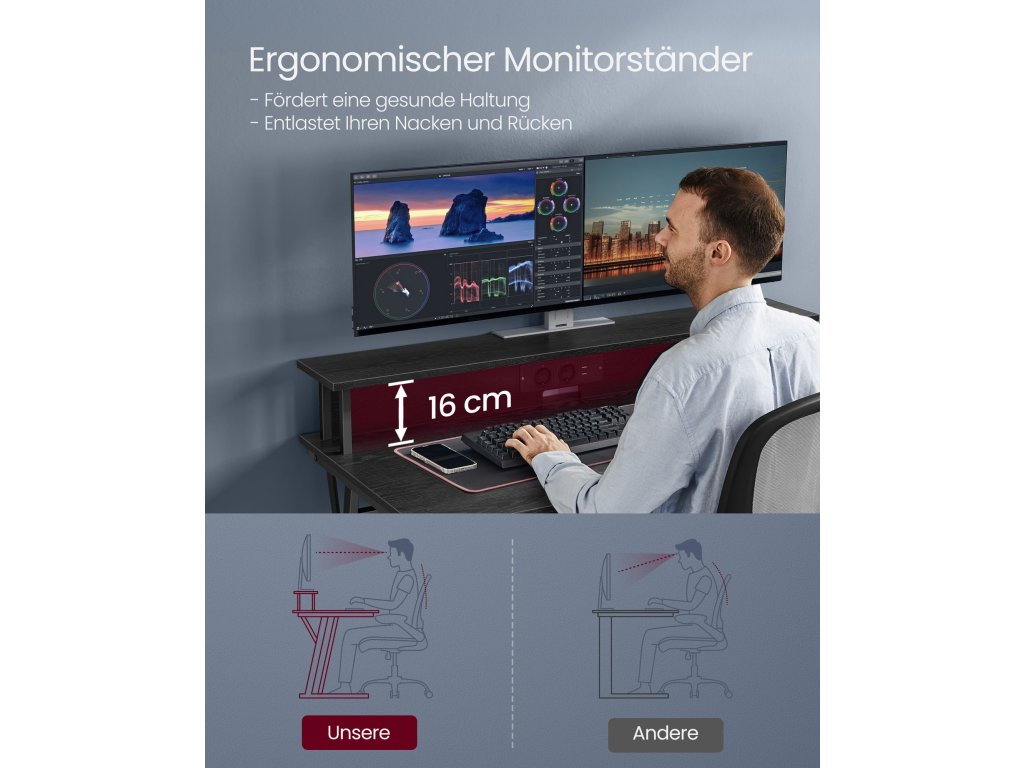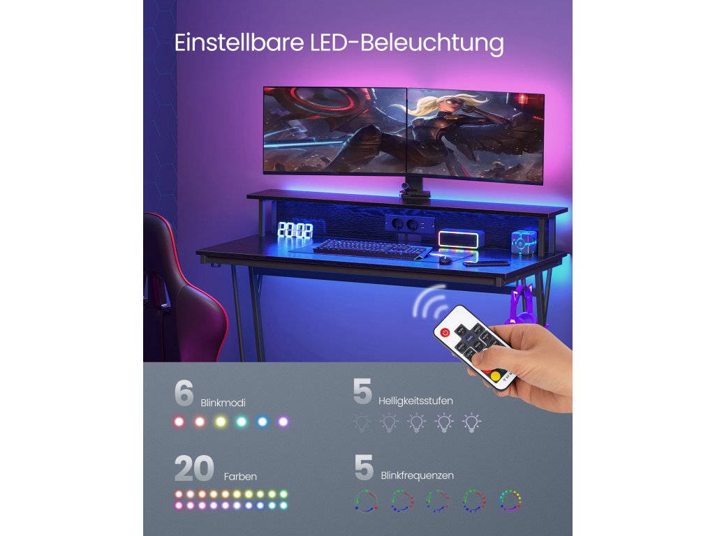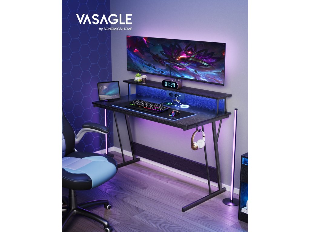 Praktická integrovaná napájecí lišta Napájecí lišta je vybavena 2 zásuvkami a 2 porty USB a umožňuje připojit několik zařízení najednou. Ponořte se naplno do herního světa bez jakéhokoli přerušování nebo starostí s načítáním.Náladová světla Tento stůl vybavený LED diodami dodá vašemu hernímu prostoru futuristický nádech. Integrovaný světelný pásek nabízí 20 barev, 6 režimů, 5 jasů a 5 různých rytmů blikání, které vytvářejí ideální atmosféru pro vaše hry.Ergonomická podpora Tento stůl je vybaven stoupačkou pro umístění 2 obrazovek ve výšce očí, což pomáhá snížit únavu krku a zad. Přihrádka pod ním je vhodná pro uloženíRobustní, stabilní Stolová deska s ocelovým rámem vyztuženým příčkou ve spodní části unese až 100 kg. Nastavitelné nožičky zajišťují dobrou stabilitu i na mírně nerovném terénu, nedochází k rušivému kývání.Jednoduchá montáž Tento herní stůl s LED světly lze díky jednoduché konstrukci, očíslovaným dílům a ilustrovanému návodu sestavit během okamžiku. Své oblíbené videohry budete moci začít hrát během okamžiku.| Kategorie: | Psací a pracovní stoly |