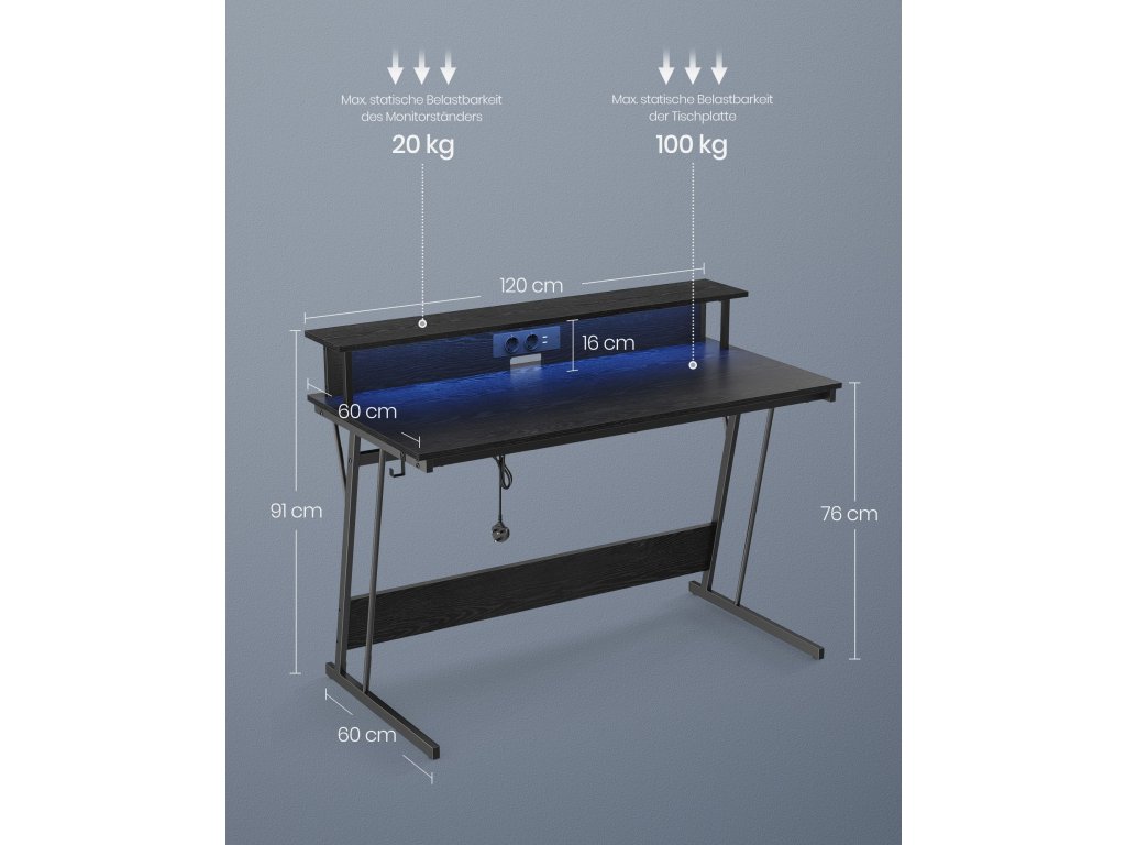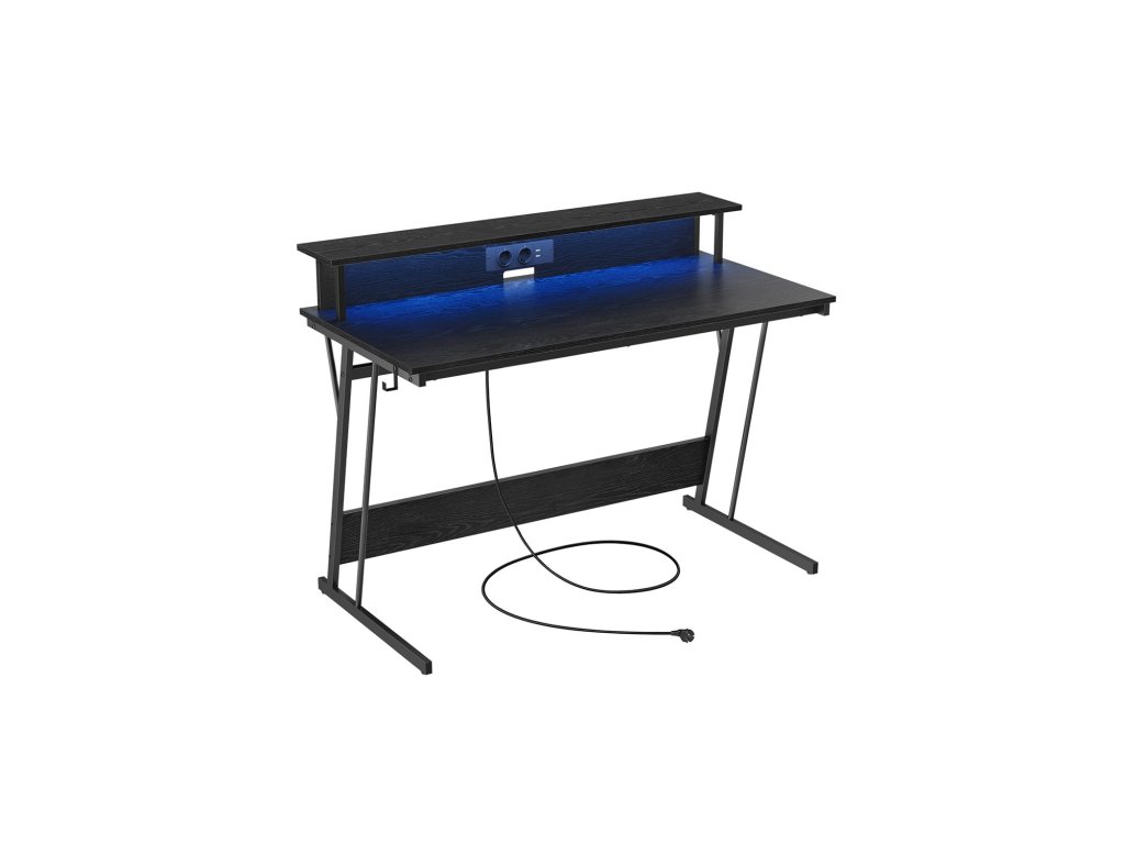Herní stůl s LED diodami a napájecím pásem, herní stůl, počítačový stůl s podstavcem na obrazovku, pro 2 počítače, do ložnice, 60 x 120 x 76 cm, klasická černá.