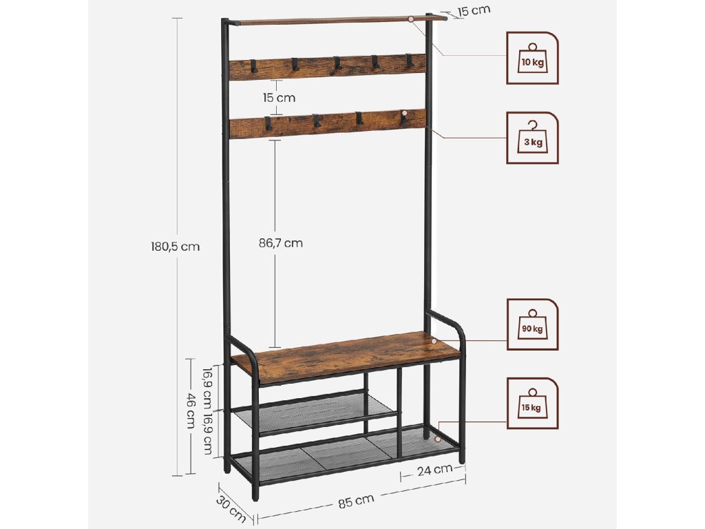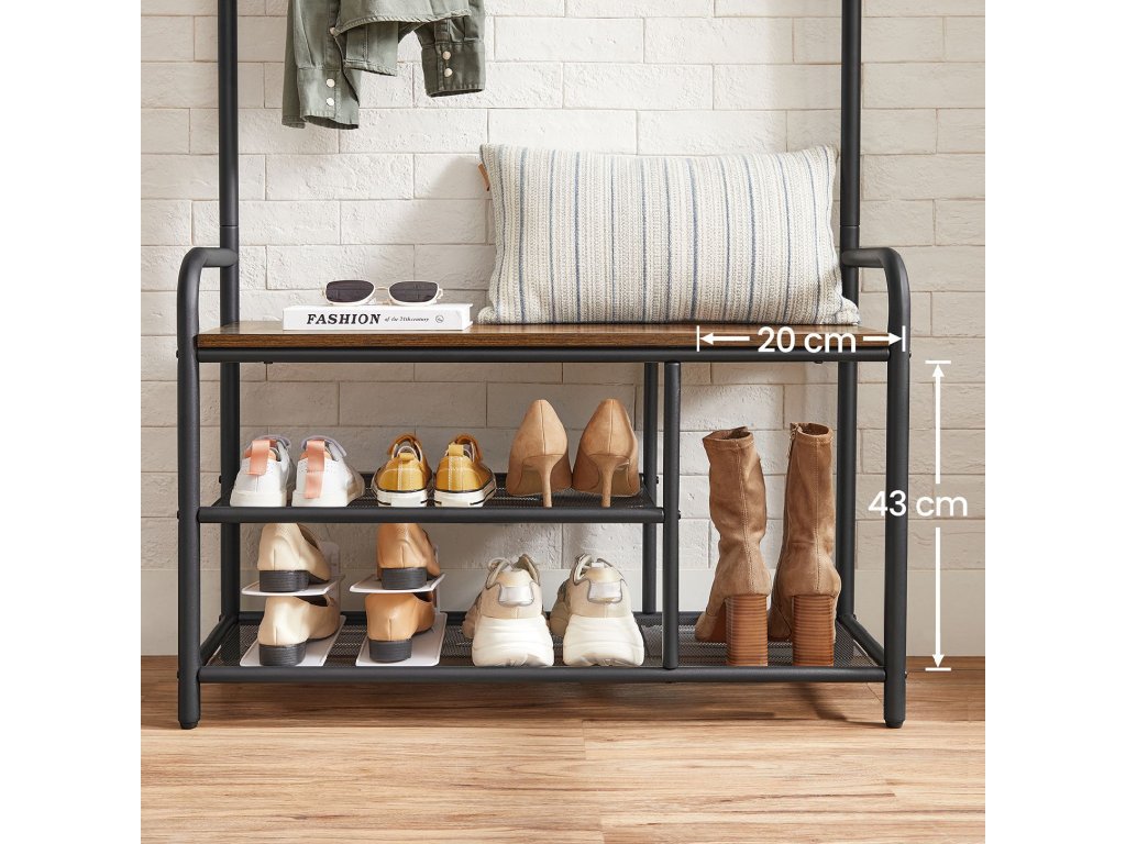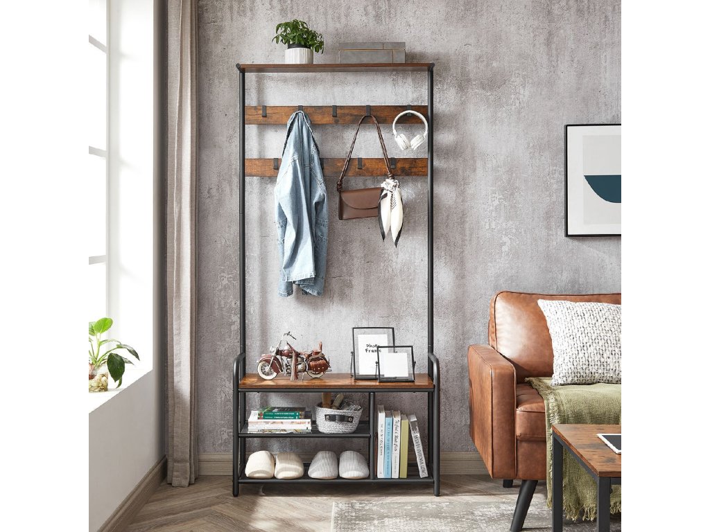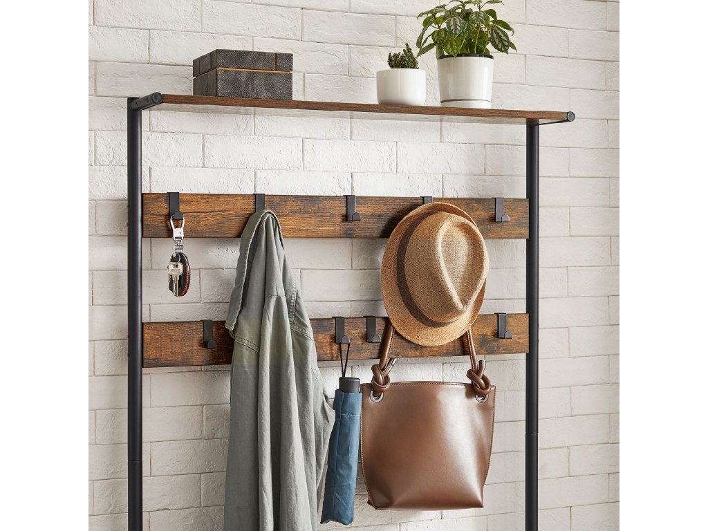 Věšák na kabáty s lavicí na boty, 9 odnímatelných háčků, horní police pro vchod, předsíň, ložnici, rustikální hnědá a černá barva.