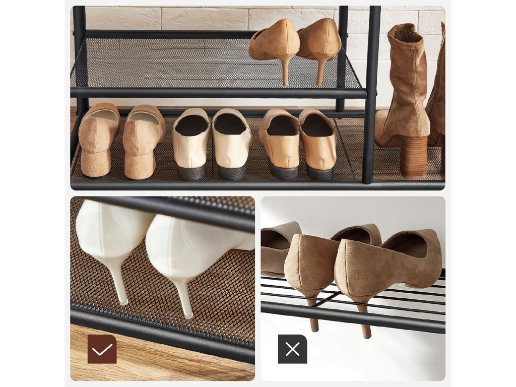 Vítejte u dalších bot: Nastavitelné mřížky se snadno přizpůsobí různým velikostem bot. Jemná síťka zabraňuje vypadávání drobných předmětů a zároveň zabraňuje zachycení podpatkůCHYTRÉ SKLADOVÁNÍ: Předsíňová skříň s 1 deskou v horní části, 9 háčky, 2 síťovanými policemi a lavicí vám umožní umístit dekorace, pověsit bundy, uložit boty a posedět. Perfektní!PRŮMYSLOVÉ A VŠESTRANNÉ: Podívejte se na tento rustikální věšák, který kombinuje rustikální hnědou a matnou černou barvu a je ideální pro vaši předsíň, obývací pokoj a ložnici.SILNÝ STOJAN - Nebojte se položit těžké krabice nebo si sednout, protože lavice této šatny unese až 90 kg. Nastavitelné nožky a sada proti překlopení posilují stabilitu