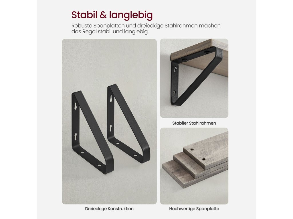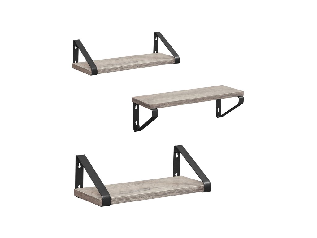 Plovoucí police, sada 3 nástěnných robustních polic, šedá a černá.