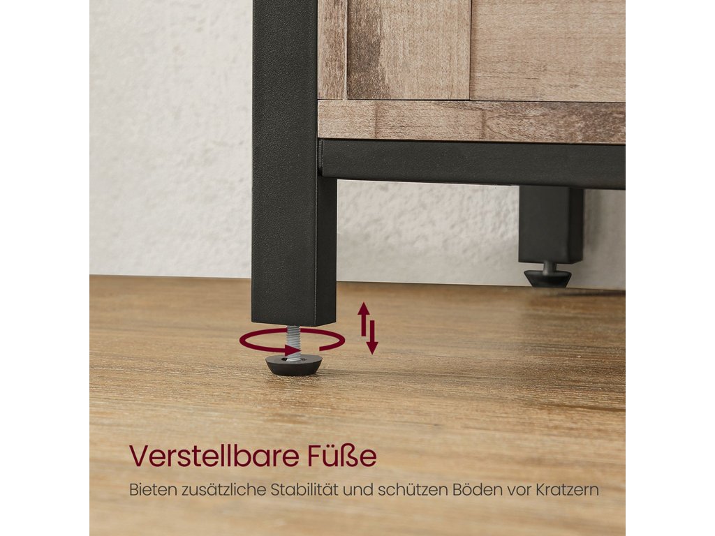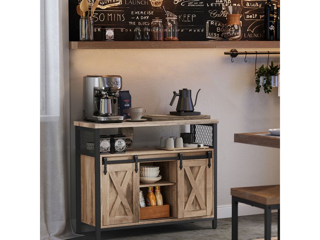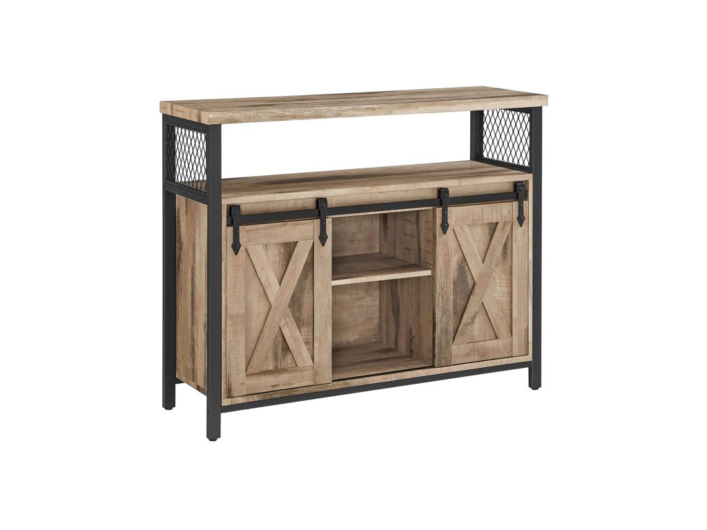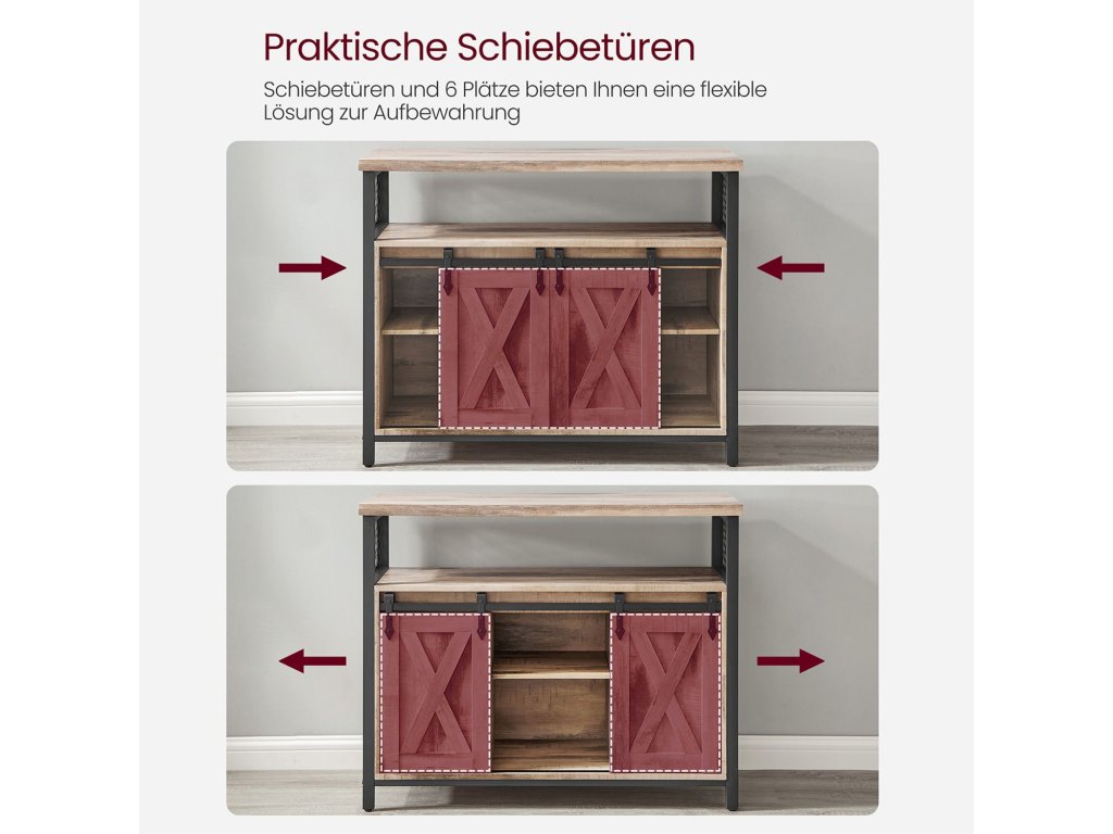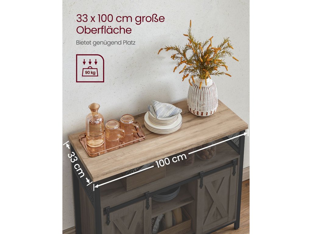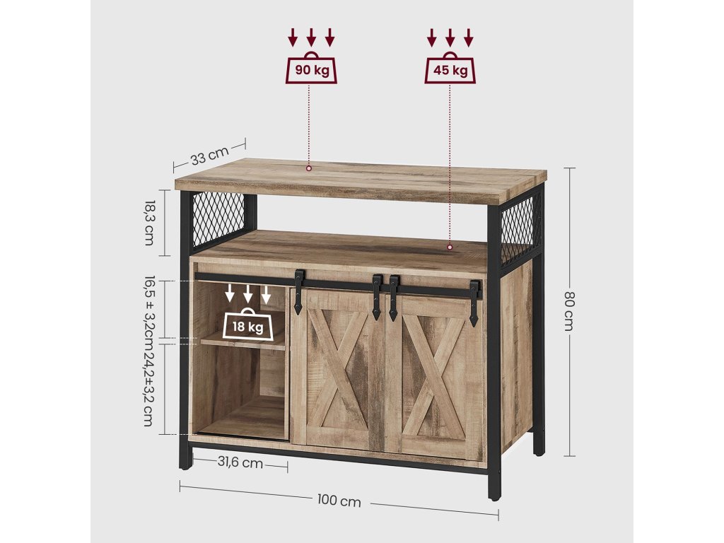 Unikátní posuvné dveře Rustikální dveře, symetrické uspořádání - dvoje posuvné dveře dodávají této kuchyňské skříňce venkovský styl, který lze snadno začlenit do mnoha stylů interiéru.Flexibilní úložiště: 6 míst a tři výškově nastavitelné police ve třech úrovních (také odnímatelné) pro předměty různých velikostí; deska stolu o rozměrech 33 x 100 cm pro více možností.Robustní a pevný: kombinace dřevotřísky a kvalitního kovového rámu dodává příborníku vysokou stabilitu a pevnost. Nastavitelné nožičky udržují skříňku v rovnováze a ochrana proti naklonění zajišťuje větší stabilitu.Všestranné využití: tuto skříňku můžete použít jako příborník v kuchyni, jako skříňku na drobnosti v předsíni, jako skříňku na televizi v obývacím pokoji nebo jako skříňku na dokumenty v domácí kanceláři.Snadná instalace Díky jasnému návodu a označeným dílům je montáž této kuchyňské skříňky hračkou. Součástí balení jsou také náhradní šrouby| Kategorie: | Komody |