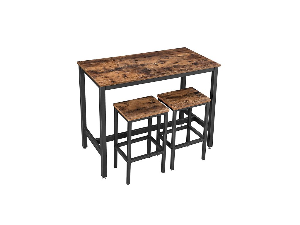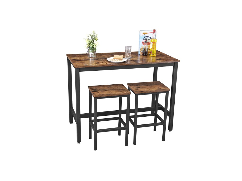 Sada pro náročné: Barový stůl a 2 barové židle s kvalitním rustikálním hnědým povrchem - skvělý doplněk do kuchyně, herny nebo obývacího pokoje. Černý ocelový rám nejenže tvoří atraktivní kontrast k tónu dřeva, ale slouží také jako praktická opěrka nohou.Snídaně pro dva? Vysoký stůl má plochu 120 x 60 cm, na kterou lze snadno umístit rohlíky, uzeniny a čerstvě vymačkaný pomerančový džus. Objednejte si další 2 barové židle a vytvořte si snídaňový stůl pro 4 osoby.