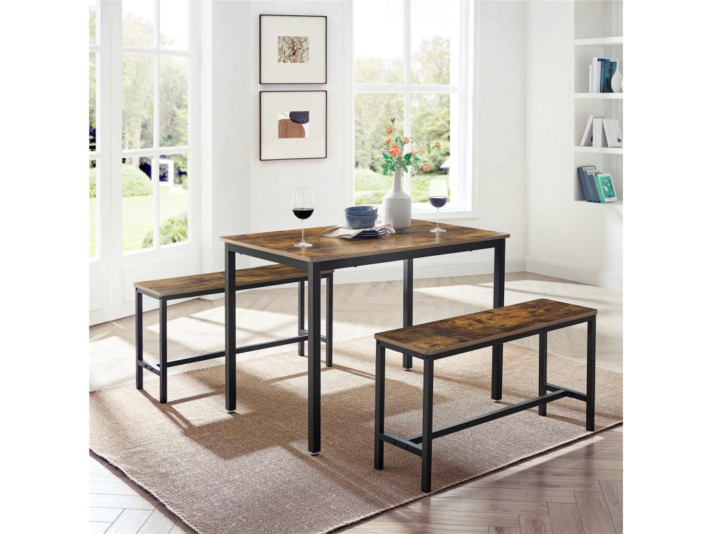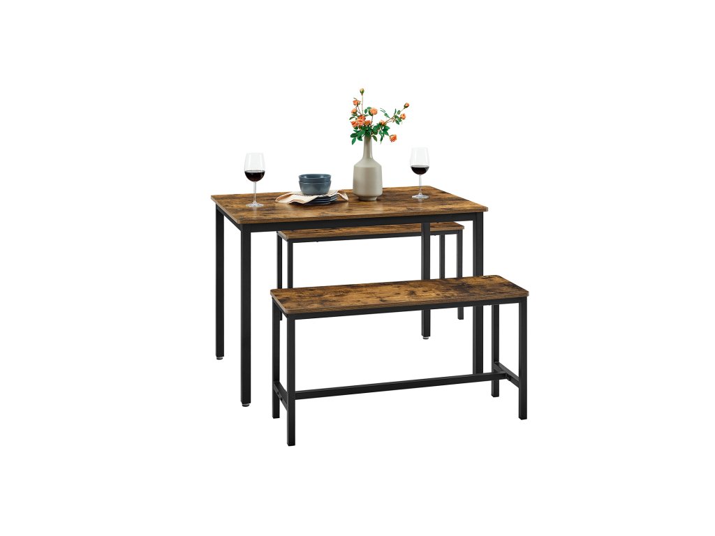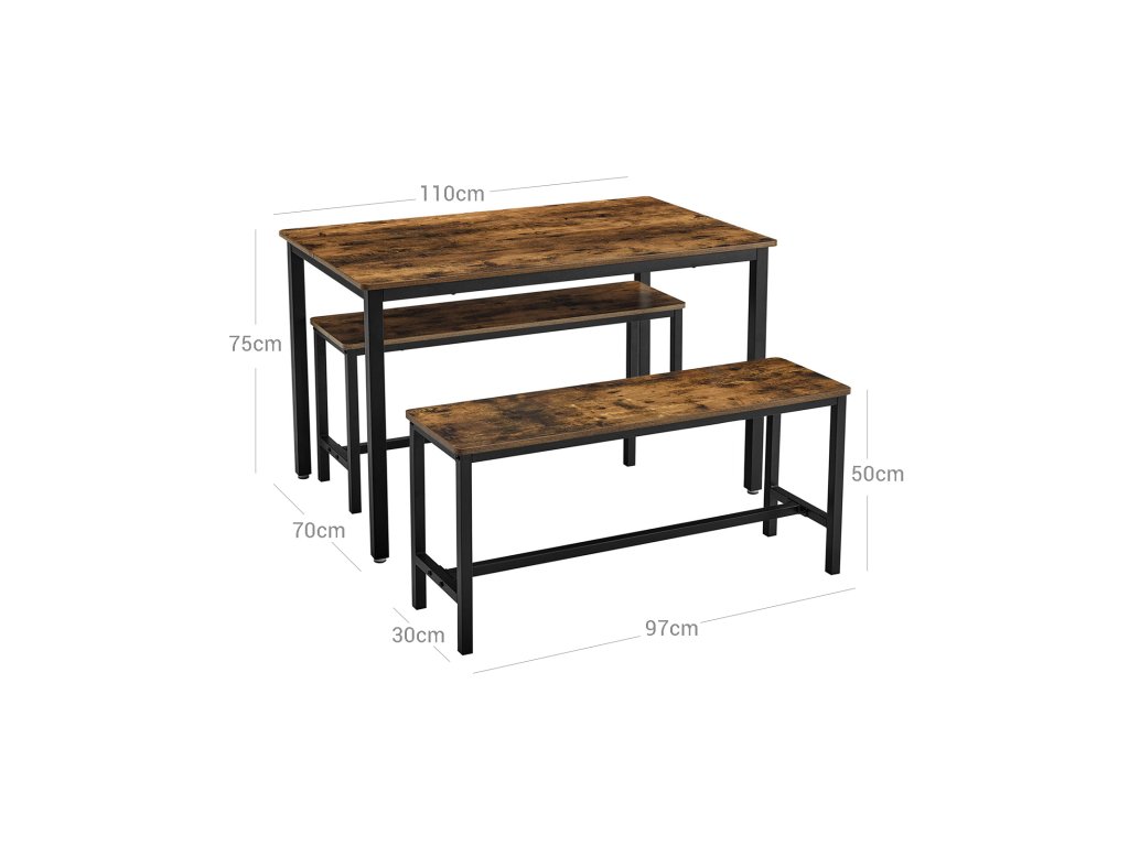 Jídelní stůl se 2 lavicemi, sada 3 kusů, kuchyňský stůl 110 x 70 x 75 cm, 2 lavice po 97 x 30 x 50 cm, ocelový rám, průmyslový design, rustikální hnědá a černá.