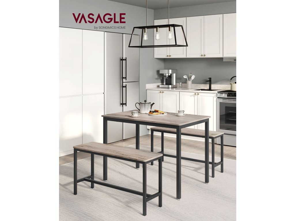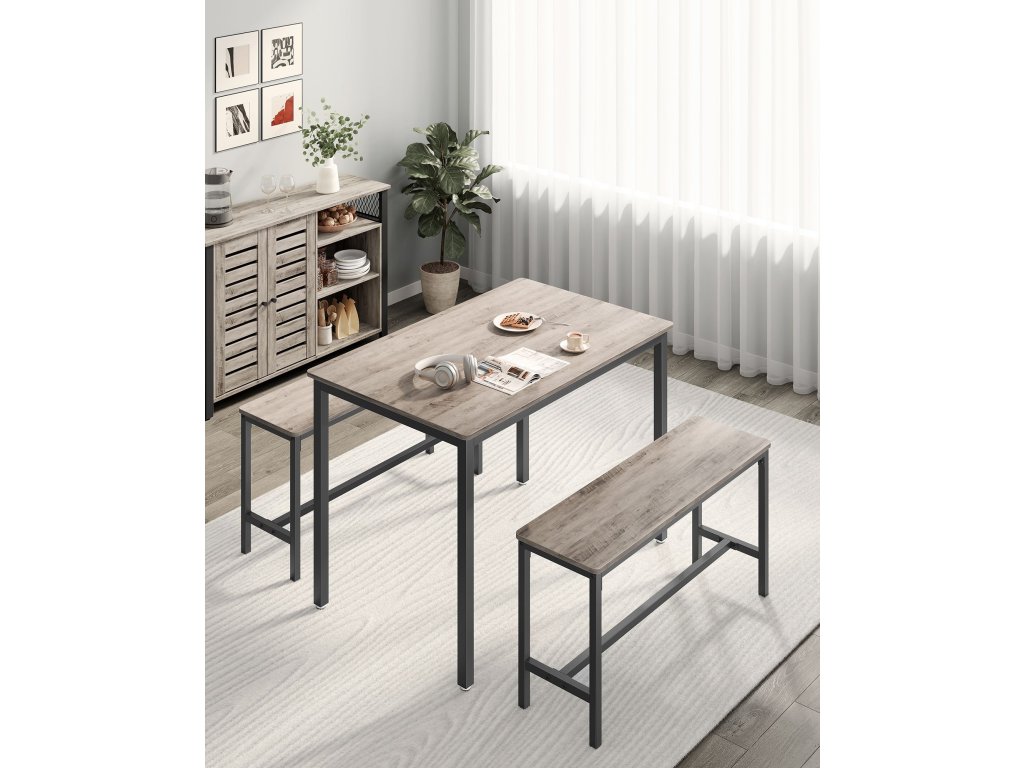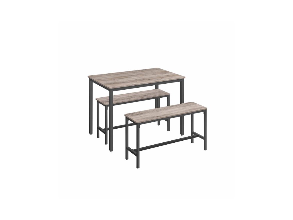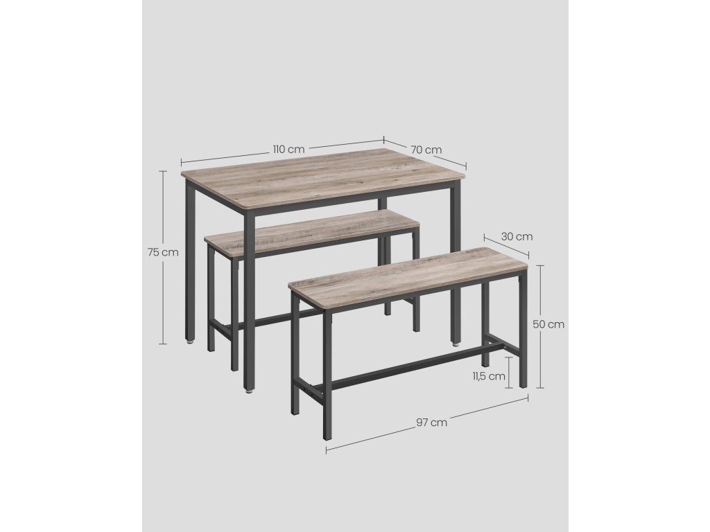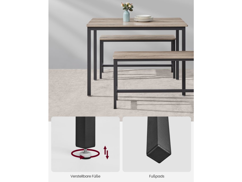 Jídelní set pro 4 osoby Tento jídelní set se skládá ze stolu o rozměrech 70 x 110 cm a 2 lavic a je ideální pro rodinnou večeři, rychlou snídani nebo posezení s přáteli.Úspora místa Dvě lavice o výšce 50 cm lze po jídle uložit pod jídelní stůl o výšce 75 cm, takže tento jídelní set je ideálním řešením pro malé prostory, abyste měli pořádek.Elegantní průmyslový design Kombinace béžové skvrnité a inkoustově černé barvy vytváří industriální styl. Tato sedací souprava dodá vaší jídelně, kuchyni nebo obývacímu pokoji nádech moderního života.Pevný a odolný Ocelové rámy zajišťují vysokou stabilitu a povrchy z dřevotřísky jsou odolné a snadno se čistí - tato sada kuchyňských stolů je určena pro každodenní stolování.Montáž bez starostí Žádná složitá montáž. Díky jasnému návodu, označeným dílům a přiloženému montážnímu nářadí sestavíte tento jídelní set s lavicí během chvilky.| Kategorie: | Jídelní stoly |