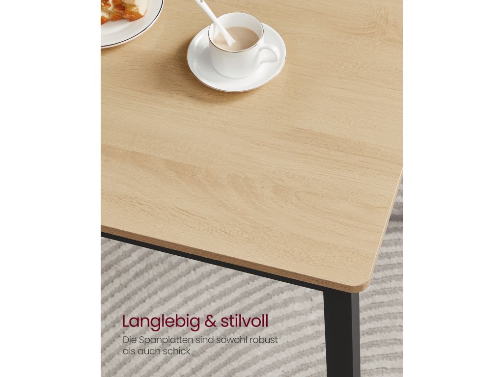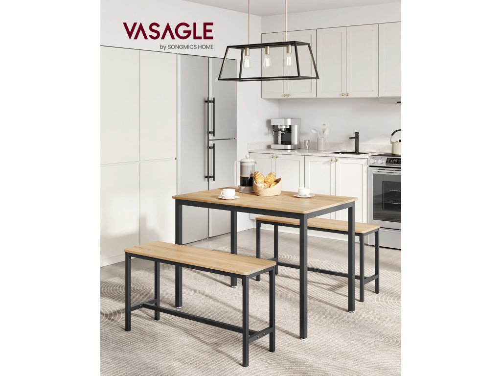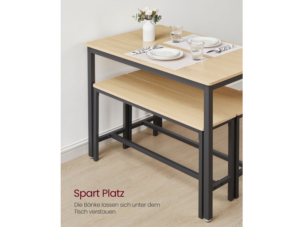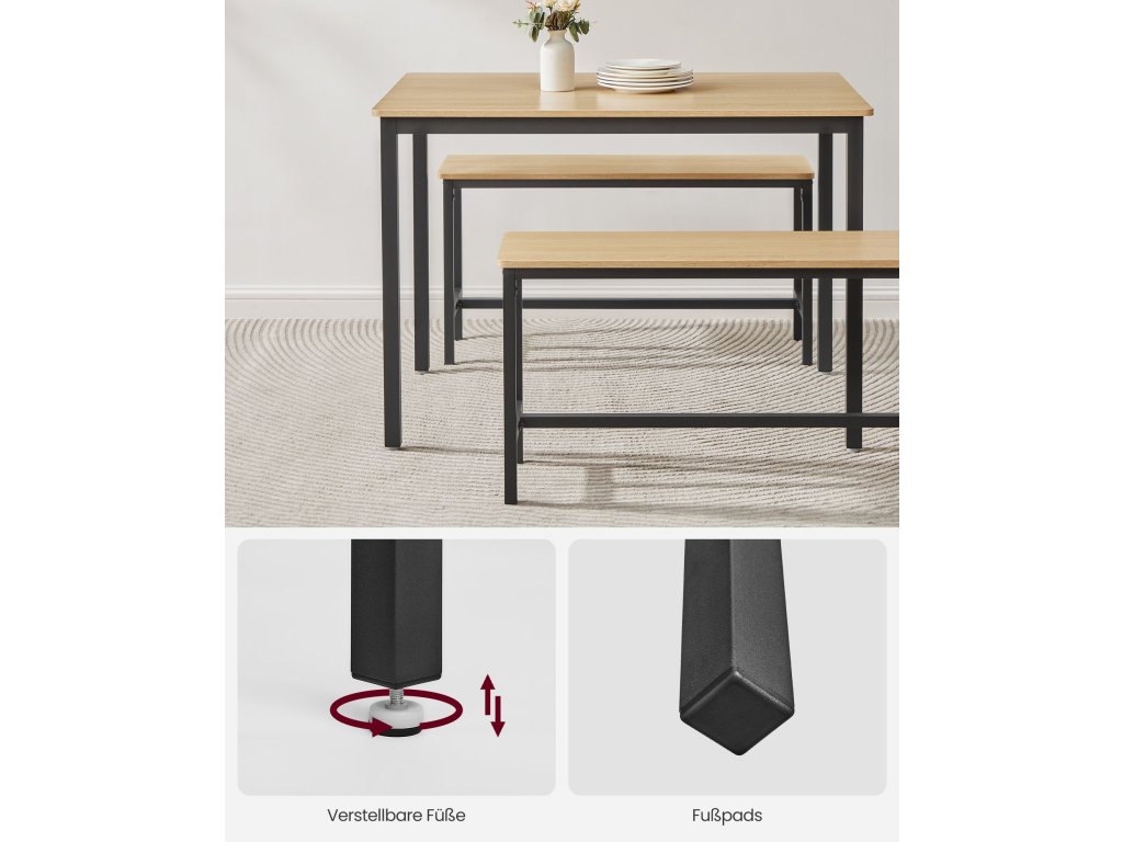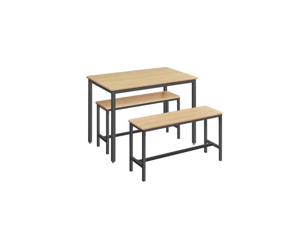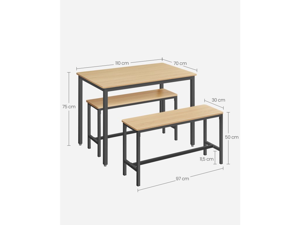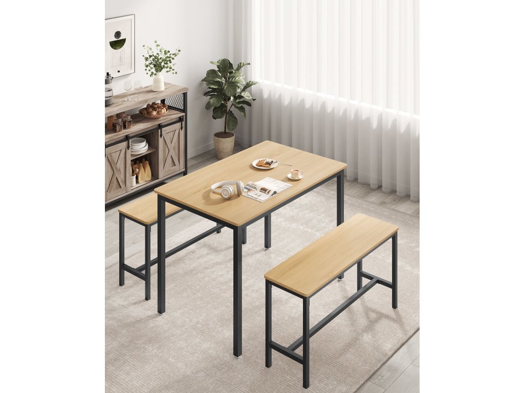 Jídelní set pro 4 osoby Tento jídelní set se skládá ze stolu o rozměrech 70 x 110 cm a 2 lavic a je ideální pro rodinnou večeři, rychlou snídani nebo posezení s přáteli.Úspora místa Dvě lavice o výšce 50 cm lze po jídle uložit pod jídelní stůl o výšce 75 cm, takže tento jídelní set je ideálním řešením pro malé prostory, abyste měli pořádek.Elegantní moderní design Kombinace barev zlatého dubu a inkoustově černé vytváří moderní styl. Tato sedací souprava dodá vaší jídelně, kuchyni nebo obývacímu pokoji nádech moderního života.Pevný a odolný Ocelové rámy zajišťují vysokou stabilitu a povrchy z dřevotřísky jsou odolné a snadno se čistí - tato sada kuchyňských stolů je určena pro každodenní stolování.Montáž bez starostí Žádná složitá montáž. Díky jasnému návodu, označeným dílům a přiloženému montážnímu nářadí sestavíte tento jídelní set s lavicí během chvilky.| Kategorie: | Jídelní stoly |