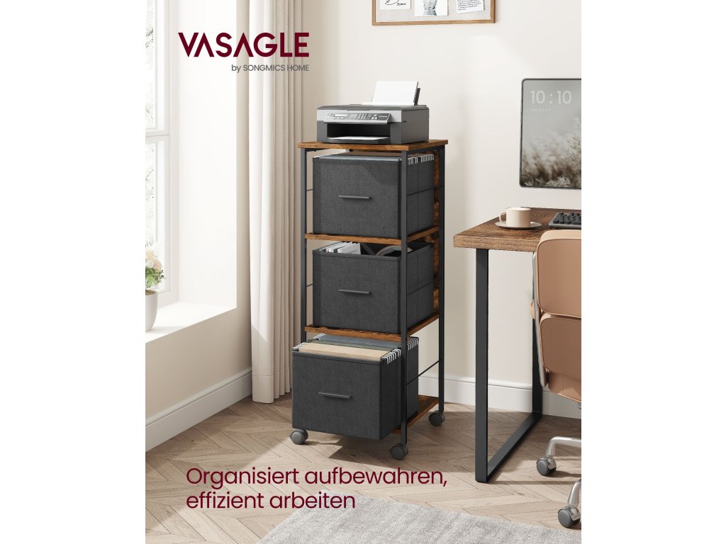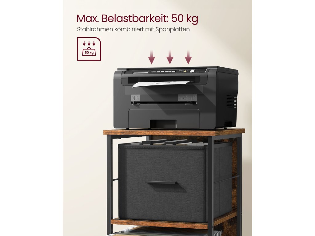 Kartotéka se 3 zásuvkami, stojan na tiskárnu, na pořadače formátu A4 a Letter, závěsné pořadače, úložný box, domácí kancelář, rustikální hnědá a inkoustově černá.