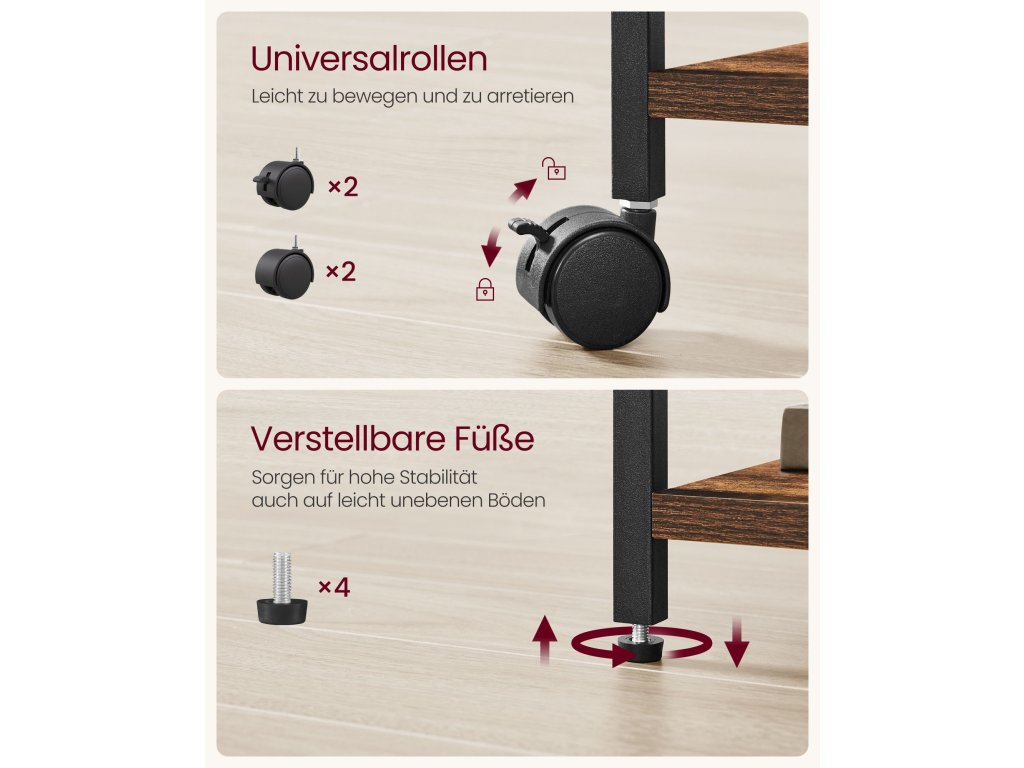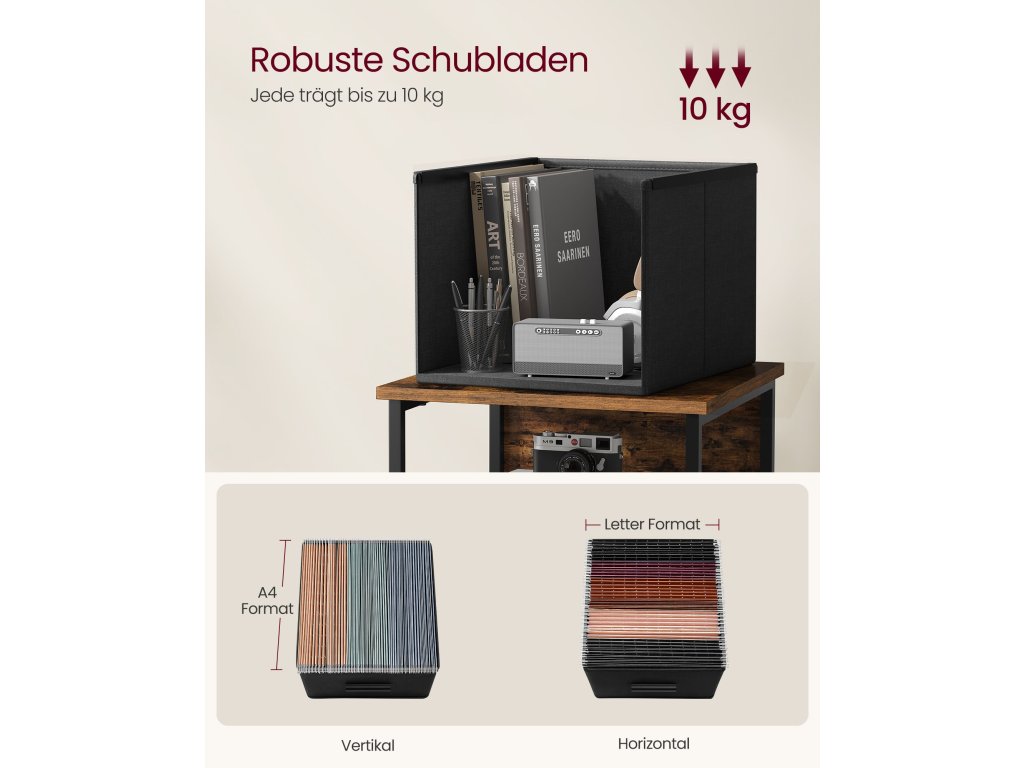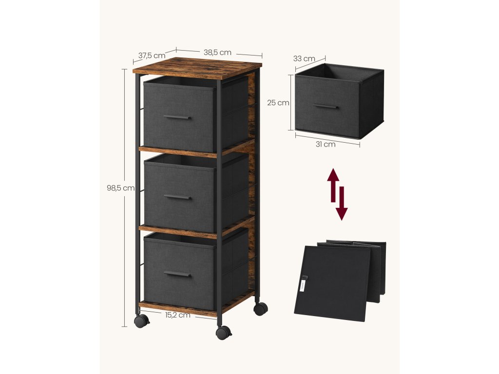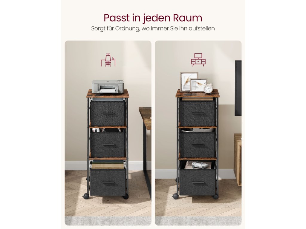 Organizovanost a efektivita 3 látkové zásuvky umožňují snadné zavěšení složek formátu A4 a dopisů, zatímco mezera nad zásuvkami zajišťuje rychlý přístup k označeným složkám. Optimalizujte prostor a maximalizujte efektivitu s tímto kompaktním boxem na dokumenty.Všestranné využití Přeměňte skříňku na elegantní stojan na tiskárnu pro domácí kancelář nebo na stylovou odkládací polici na výtvarné potřeby a modely pro řemeslníky. Jedná se o univerzální řešení, které vyhoví různým potřebám skladování.Built to Last Úložný regál ve tvaru kostky, vyrobený z robustního ocelového rámu a dřevotřískových desek, odolá zkoušce času. Díky nosnosti až 50 kg budou vaše kancelářské potřeby v bezpečí.Roll, Lock, Level Díky čtyřem kolečkům otočným o 360°, z nichž 2 jsou opatřena brzdou, můžete kartotéku bez námahy přemístit a zaaretovat, kdekoli ji potřebujete. Nastavitelné nožičky navíc poskytují stabilní oporu a zajišťují rovný povrch na nerovných podlahách.Bezproblémová montáž Díky jasným pokynům budete mít rám připravený během chvilky. Pak vložte látkové zásuvky a můžete začít! Ale počkejte, je toho víc! Zásuvky můžete libovolně umístit, kamkoli si přejete, aby vyhovovaly vašim potřebám.| Kategorie: | Kancelářské skříně |