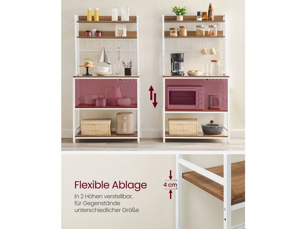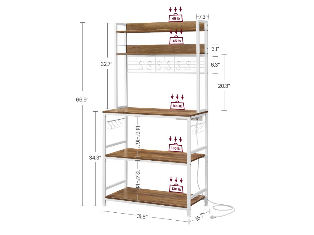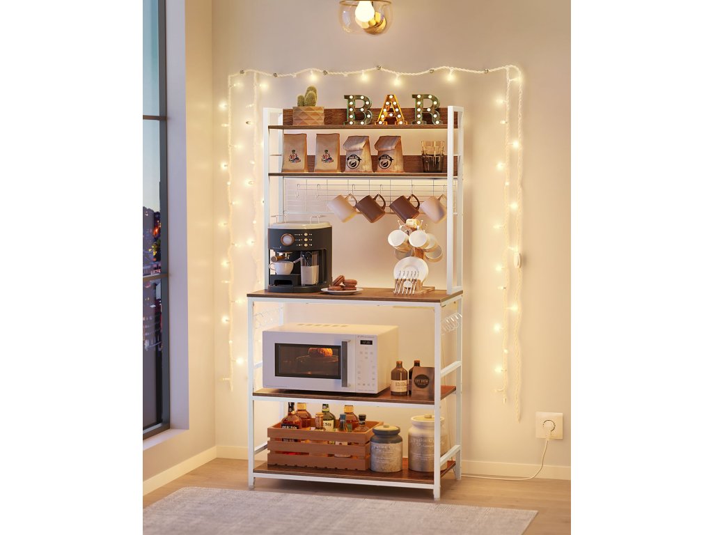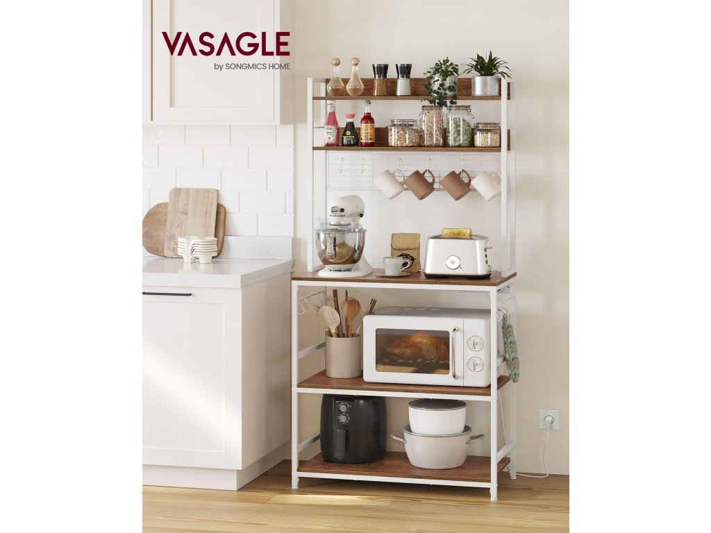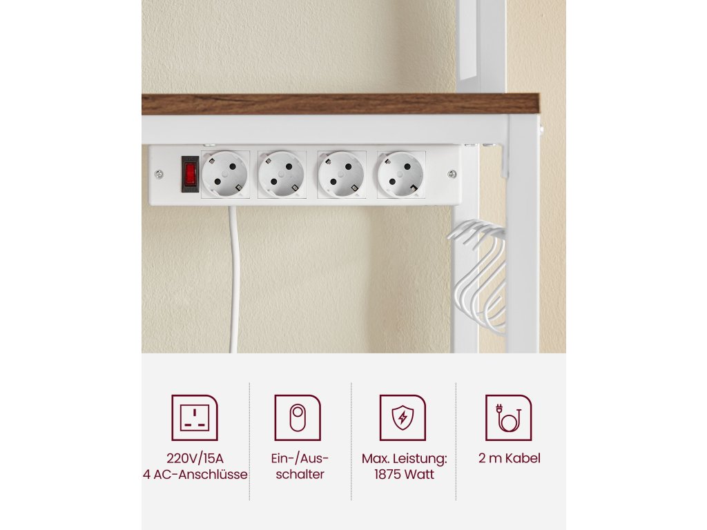 Kuchyňská polička se zásuvkami: Napájecí lišta má 4 porty, které umožňují nabíjet více zařízení najednou. Max. Výkon je 1875 wattů. Vestavěná konstrukce napájecí lišty zajišťuje přehledné vedení kabelů.Bezpečné a spolehlivé: Integrovaná napájecí lišta této stojanové police poskytuje ochranu proti přetížení, ochranu proti úniku proudu a díky tomu, že je vybavena vypínačem. lze vypnout, když se nepoužívá - to vše kvůli bezpečnosti!Nastavitelná police: prostřední police (max. Nosnost 130 lbs) Tento kuchyňský stojan lze nastavit nahoru nebo dolů o 1,6 palce, což vám umožní umístit různé velikosti nádobí, od malého toustovače přes mixér až po mikrovlnnou troubu.Prostorný Tento univerzální stojan s 5 policemi pro mikrovlnnou troubu, kávovar, fritézu a další spotřebiče. 14 háčků ve tvaru písmene S pro zavěšení šálků nebo lžiček na mřížku nebo na boční tyče vnese do vaší kuchyně pořádek!STURDY, STURDY, STYLISH Prvotřídní rustikální dřevotřísková deska a robustní bílý ocelový rám vytvářejí elegantní, robustní stojan na mikrovlnnou troubu, který vylepšuje váš prostor a unese až 600 kg.| Kategorie: | Regály a poličky |