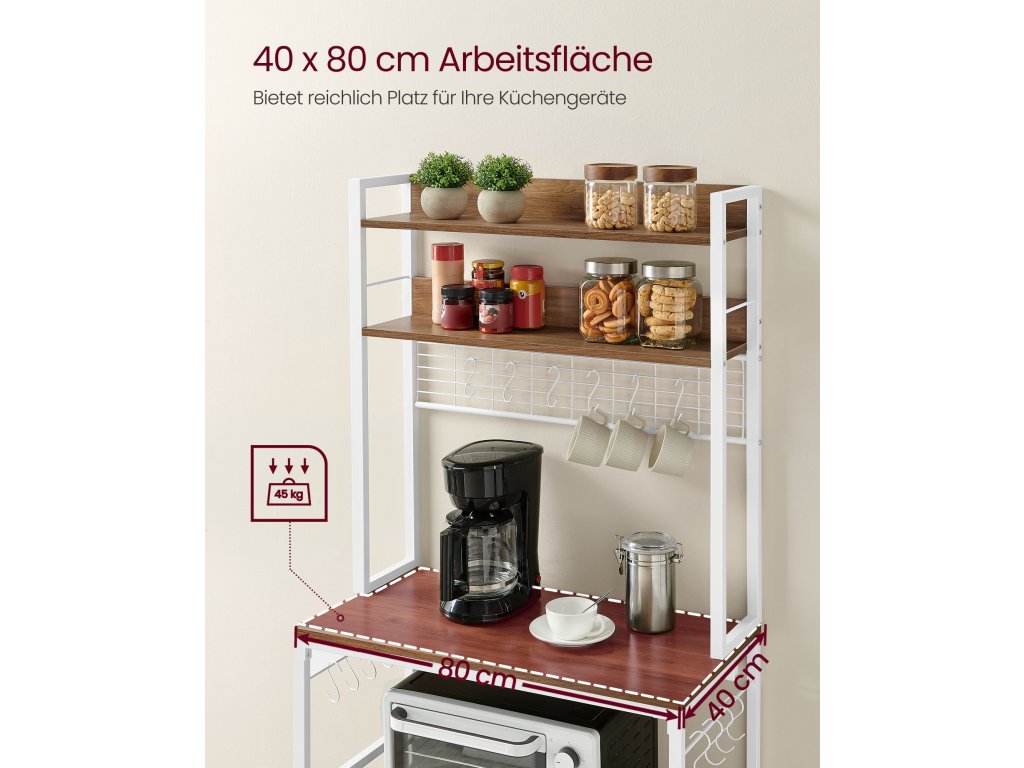 Kuchyňská police se zásuvkami, police do mikrovlnné trouby s mřížkovým talířem, 14 háčků, 40 x 80 x 170 cm, vintage hnědá/bílá.