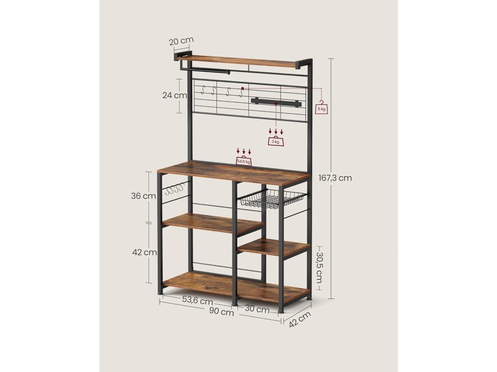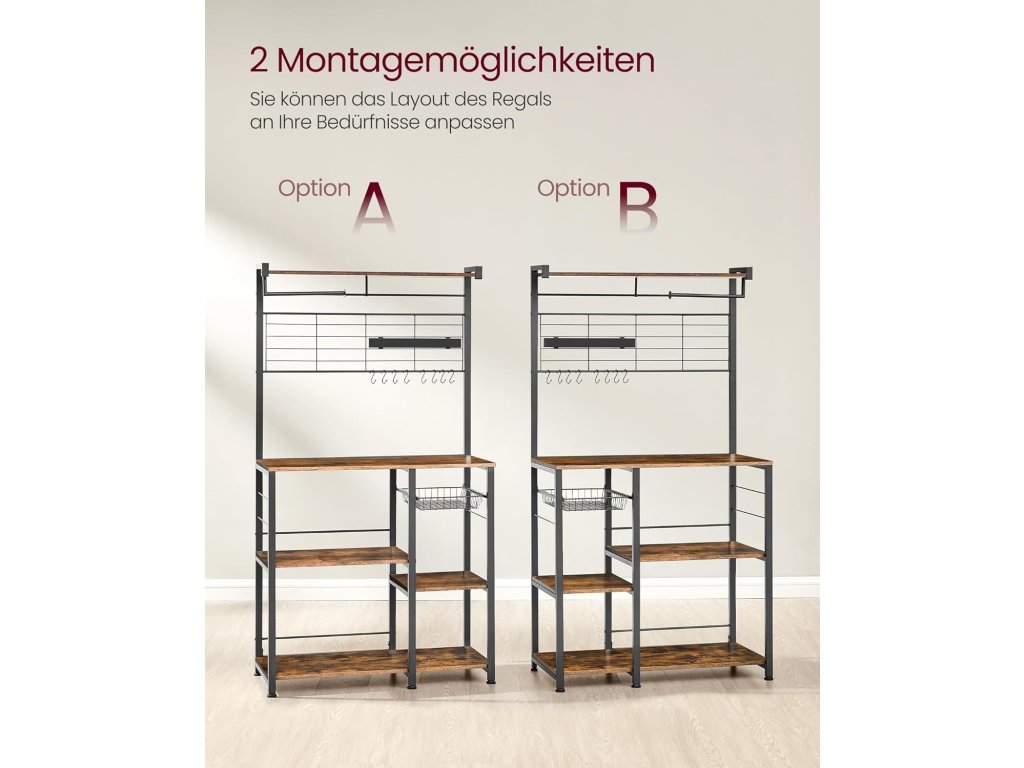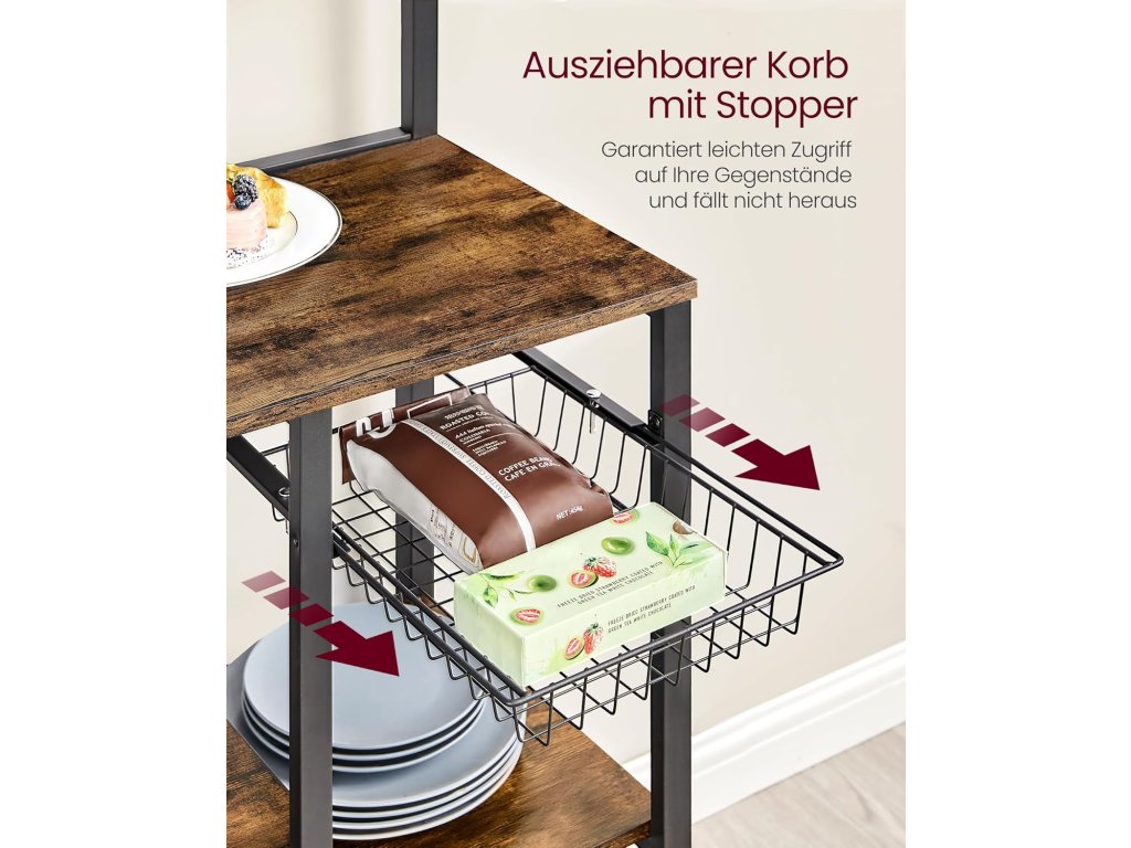Spousta úložného prostoru, mnoho možností uložení Horní deska na koření, 12 háčků na pánve, špachtle nebo metličky, police na kávovar Topinkovač, mikrovlnná trouba atd. - Udělejte si pořádek v kuchyni, abyste mohli efektivněji vařit.Magnetická lišta a držák na kuchyňské rohlíky: S magnetickým držákem na nože (přilnavost 3 kg) můžete nože bezpečně zavěsit, aby rychle uschly a vy k nim měli snadný přístup. Díky držáku na rohlíky lze kuchyňské rohlíky uložit na dosah ruky.2 možnosti montáže Označené díly a přehledný návod vám pomohou snadno sestavit tuto stojící polici. Malou polici, držák na kuchyňský papír a lištu na nože můžete připevnit vlevo nebo vpravo.Praktický výsuvný košík Drobné kuchyňské náčiní lze uložit do košíku této kuchyňské police. Je výsuvný, takže k němu máte snadný přístup. Je také vybaven zátkou, aby nevypadl.Stabilní a bezpečná Díky vysoce kvalitní dřevotřískové desce a robustnímu ocelovému rámu je police na mikrovlnné trouby pevná a stabilní. Přiložená ochrana proti naklonění vytváří bezpečné prostředí pro používání| Kategorie: | Regály a poličky |