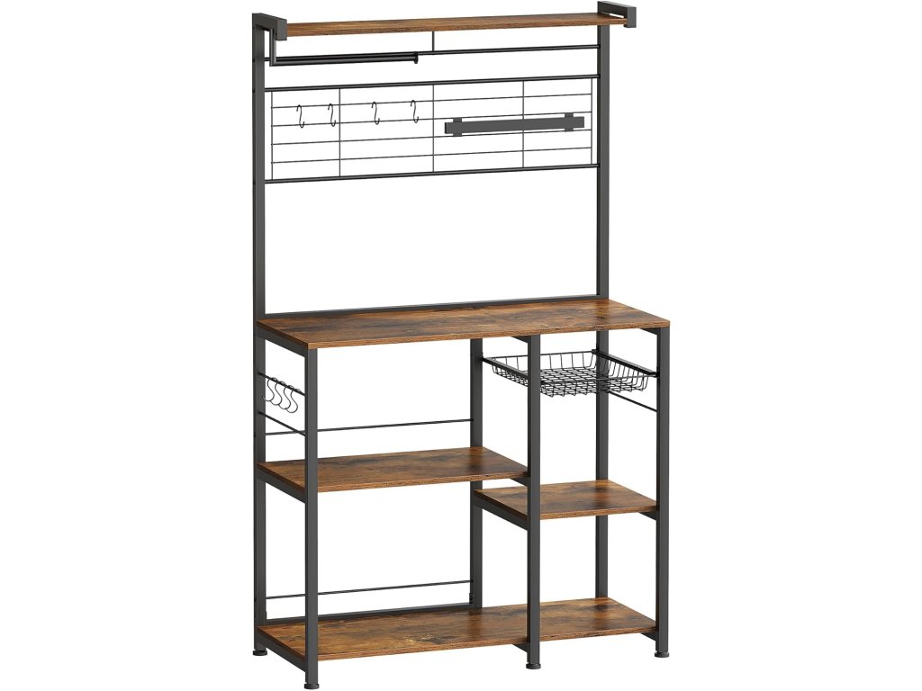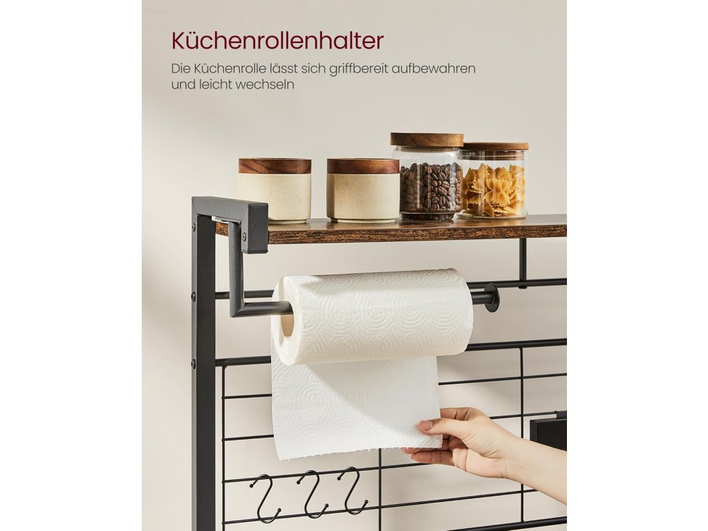 Kuchyňská polička, stojící polička, pracovní deska, kuchyňský ostrůvek s magnetickou lištou na nože, drátěný koš, držák na kuchyňské role, 12 háčků, vintage hnědá/černá.