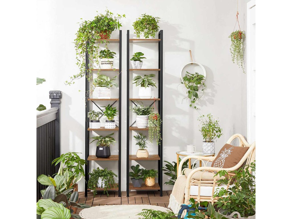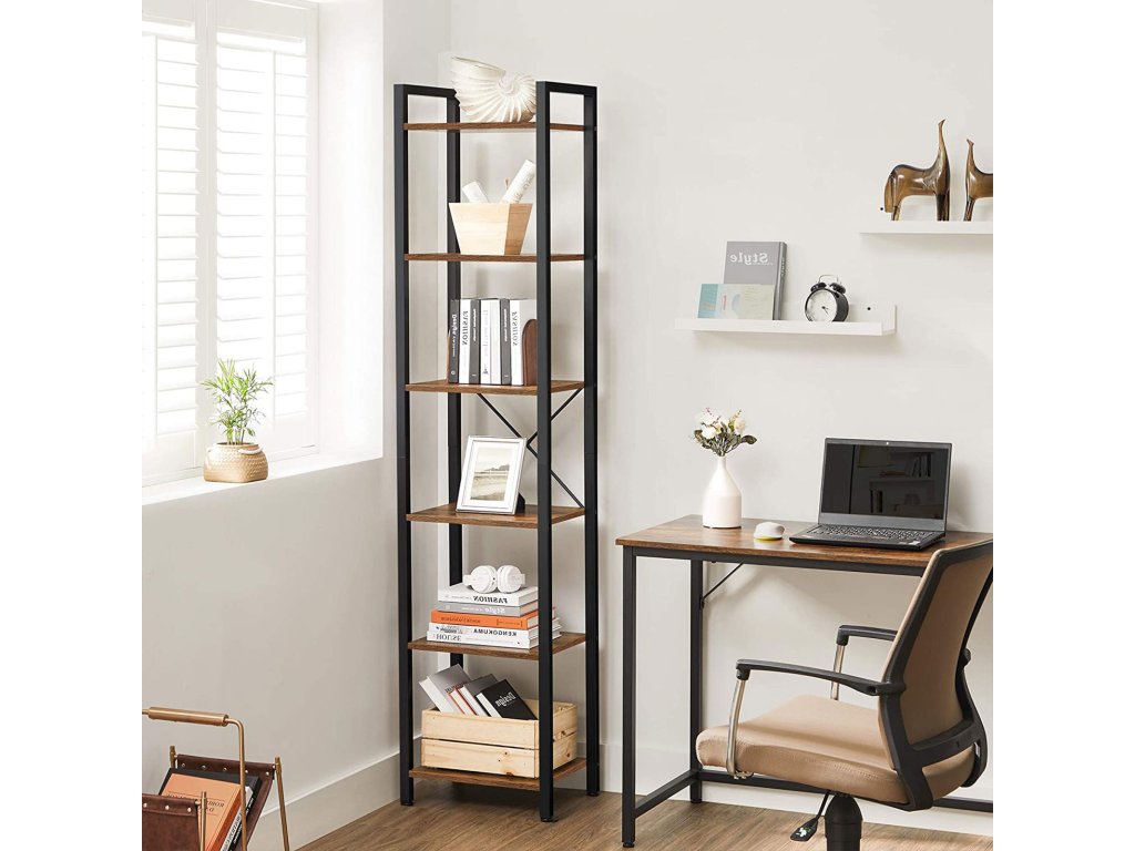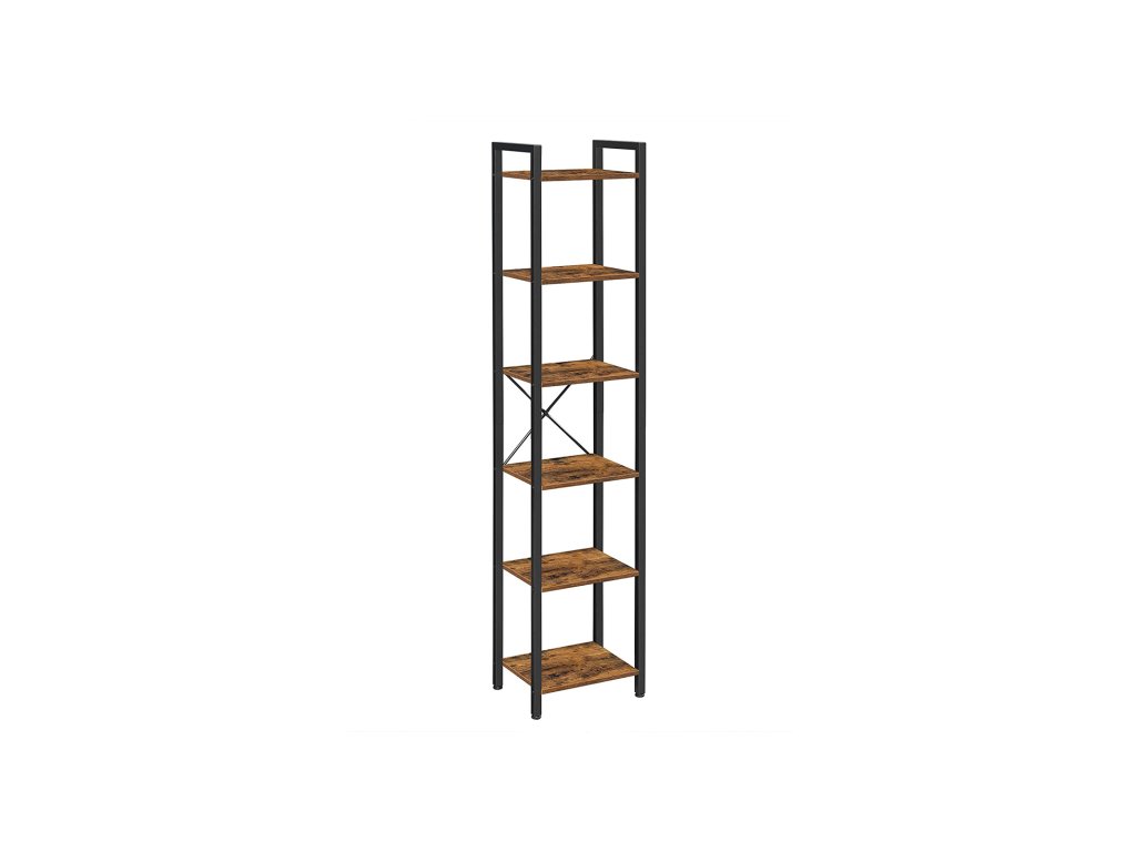 Knihovna, 6patrový regál, otevřený úložný regál, stojanový stojan, pro kancelář, obývací pokoj, ložnici, 40 x 30 x 187,5 cm, industriální, rustikální hnědá a černá.