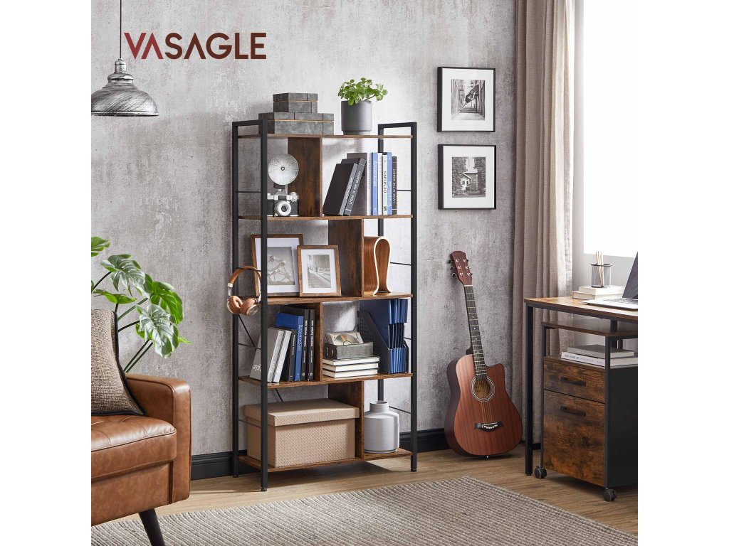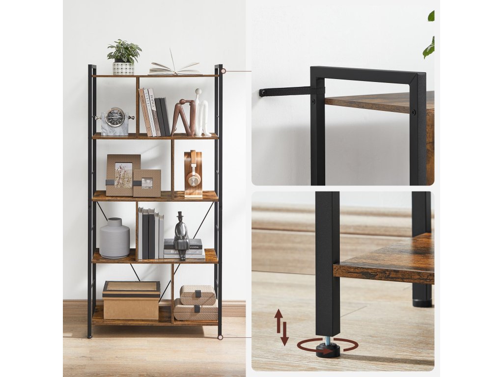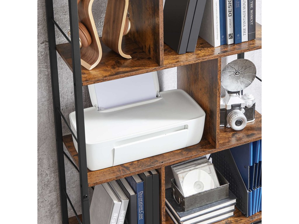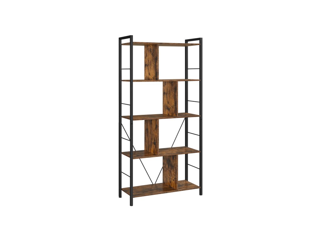 Knihovna, regál na knihy, pětipatrový regál do obývacího pokoje, průmyslový úložný regál s otevřenými přihrádkami pro domácí kancelář, ložnici, průmyslový styl, rustikální hnědá a černá.