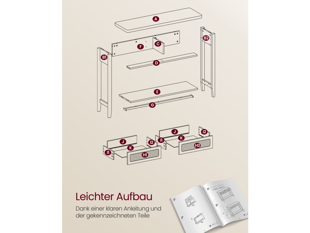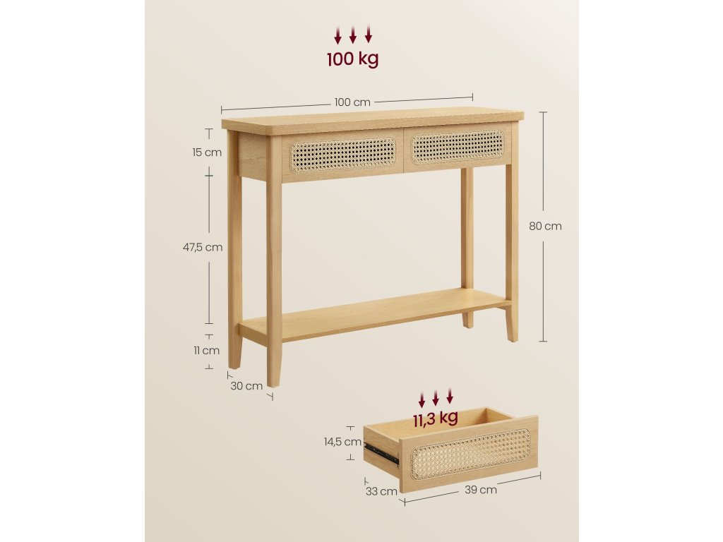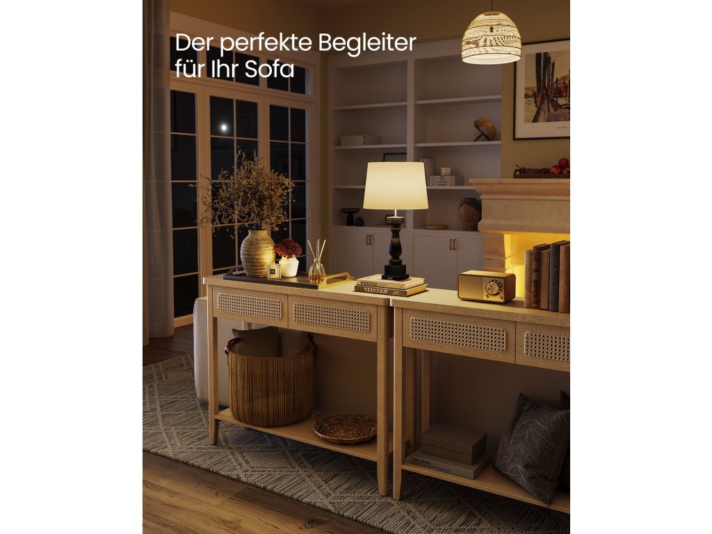 Invite Boho Charm In Tento konzolový stolek vyzařuje bohémský půvab díky zemitému odstínu, který souzní s přírodními prvky, a přední straně zásuvky z PVC ratanu, která dodává další vrstvu textury. Skvěle se hodí k vylepšení moderního prostoru nebo k obohacení boho interiéru.Robustní a spolehlivý Tento rozkládací stolek je vyroben ze směsi prvotřídních dřevotřískových desek, MDF a kvalitního plastového ratanu a má robustní konstrukci, která unese až 100 kg. Klidně si na něj postavte knihy, lampy, rostliny v květináčích nebo vonné svíčky!.Dostatek úložného prostoru Tento předsíňový stolek nabízí velkou desku na často používané předměty nebo dekorace, 2 prostorné zásuvky, které udrží drobné předměty skryté před zraky. a otevřenou spodní policí pro přehledné uložení bot nebo velkých předmětů, jako jsou úložné koše.Snadná údržba a montáž Díky hladkému dýhovanému povrchu MDF, který je odolný vůči vodě, je čištění hračka, stačí jej otřít vlhkým hadříkem. Montáž je bezproblémová díky jasnému návodu a označeným dílům.Všestranný univerzál Ať už tento konzolový stolek umístíte do ložnice, obývacího pokoje, vstupní haly, pracovny, jídelny nebo ke schodišti. dokonale zapadá do interiéru a zároveň nabízí elegantní podstavec pro vystavení rámečků na obrazy, váz nebo dekorací.| Kategorie: | Odkládací stolky |
