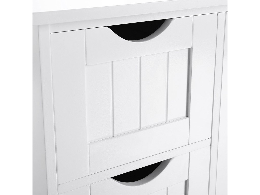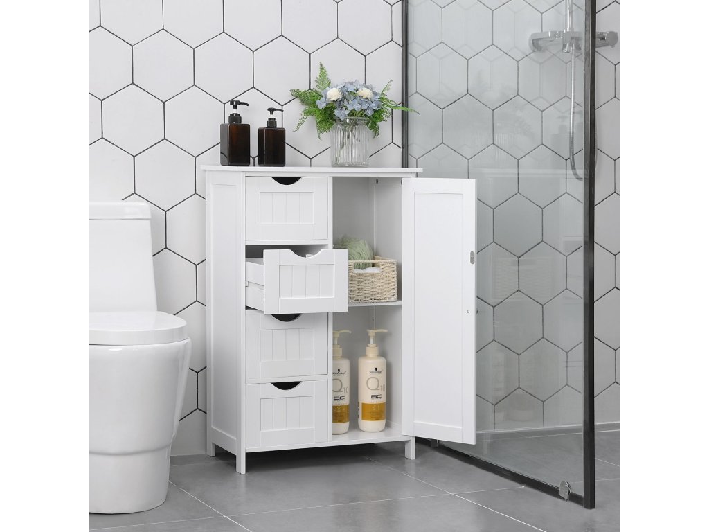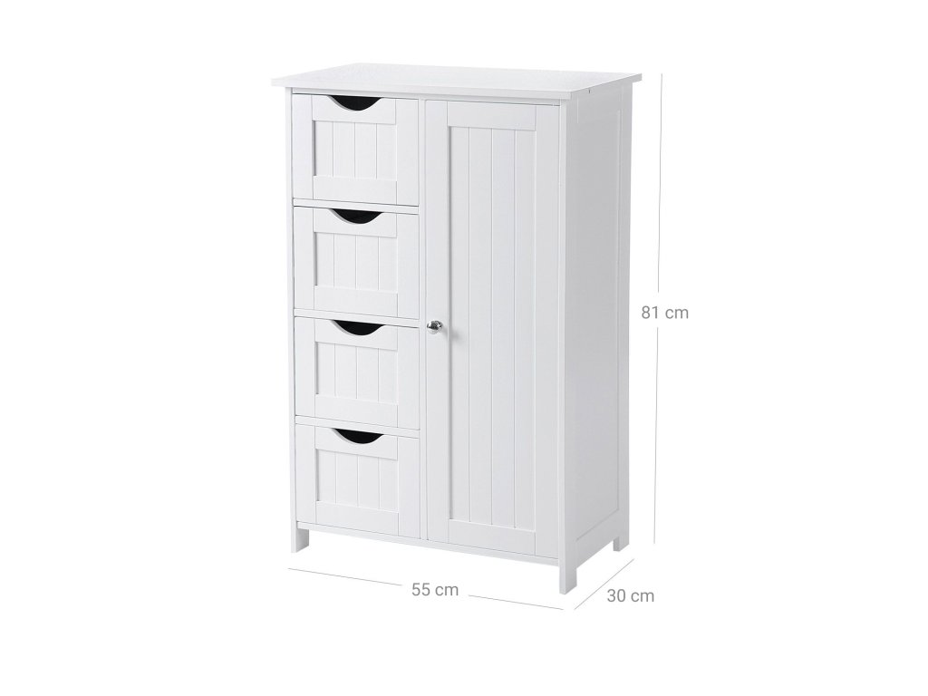 Koupelnová podlahová skříňka, dřevěná skříňka se 4 zásuvkami, jednodveřová, nastavitelná police, do obývacího pokoje, kuchyně, předsíně, bílá.