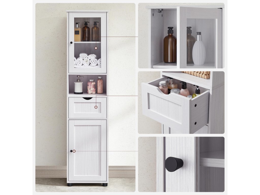 Koupelnová skříňka, sloupová skříňka s nastavitelnými policemi, dveřní skříňky, zásuvky, úspora místa, dřevo, bílá.