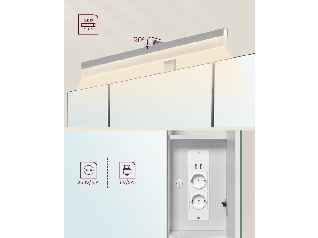 Praktické zásuvky Díky praktickým 2 zásuvkám a 2 portům USB uvnitř skříňky lze nabíjet nebo připojit fén, kulmu, elektrický kartáček na zuby a holicí strojek.Závěsný koš a držák na fén Na jedné straně je malý závěsný koš, který je vhodný pro vaše drobnosti, a na druhé straně je držák na fén. usnadnění používání vysoušeče vlasůSofistikovaný design Horní část zrcadlové skříňky je vybavena světelným proužkem, který vám usnadní pohled do zrcadla. abyste mohli snadno doplnit nástroje pro každodenní péči o pleť a líčení.Skříňka s dvířky Skryjte svá tajemství za zrcadlovými dvířky, která nejen chrání vaše soukromí, ale také dodávají vaší koupelně jednoduchou krásu.Flexibilní použití Otevřená přihrádka ve spodní části je vhodná pro uložení každodenních věcí, abyste k nim měli kdykoli přístup. To přináší do vašeho života větší flexibilitu| Kategorie: | Koupelnový nábytek |