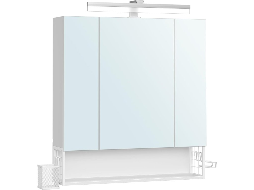 Koupelnová skříňka se 3 dveřmi, zrcadlová skříňka, nástěnná skříňka, zásuvky, závěsný koš, držák na fén, spousta úložného prostoru, do koupelny, 16,5 x 70 x 75 cm, bílá.
