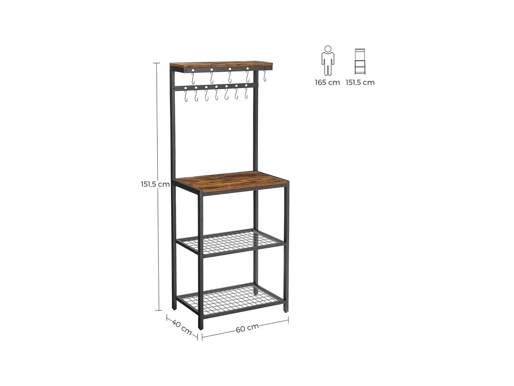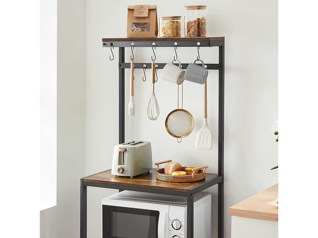 Kuchyňská skříňka, policový organizér a pekařský regál s úložnými policemi, 12 háčků, průmyslová police do mikrovlnné trouby, 60 x 40 x 151,5 cm, rustikální hnědá a černá.