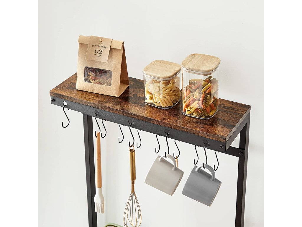 Jeho tříděné úložiště pochází z... 12 háčků a 4 polic. Zavěste hrnky a pánve na 2 řady háčků a usnadněte si přípravu jídla; horní police, povrch a 2 síťované police udržují vaše láhve, krabice a malé spotřebiče v dokonalém pořádku;