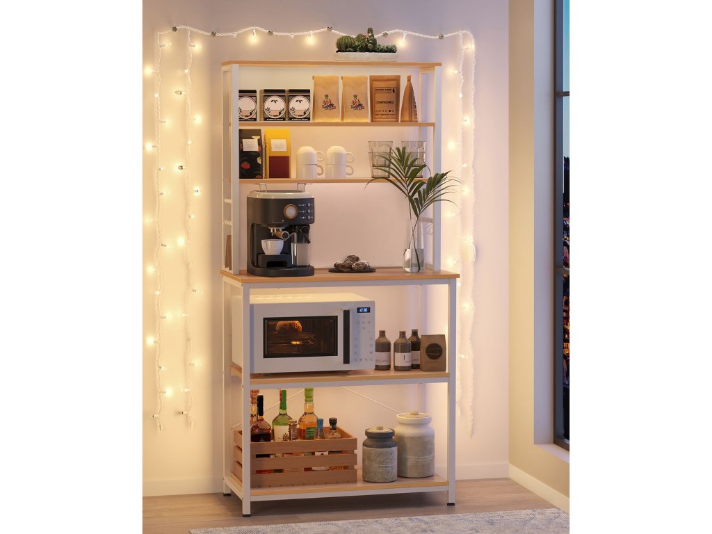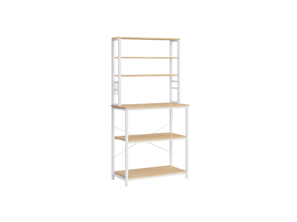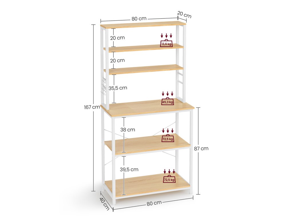 Kuchyňský policový regál, stojan na mikrovlnnou troubu 6 úrovní, 6 polic a 6 háčků, ocelový rám, průmyslový design, 40 x 80 x 167 cm, bílý dub.