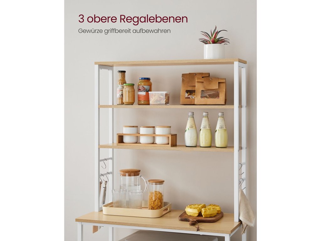 Prostorný Ušetřete místo na pracovní desce s tímto prostorným kuchyňským regálem - 3 horní police na sklenice s kořením, 3 velké spodní police na kuchyňské spotřebiče a 6 háčků S na nářadí. Tato univerzální police vnese do vaší kuchyně pořádek. [Střední police ve spodní části - výškově nastavitelná] Tuto polici lze nastavit do dvou výšek, což vám umožní umístit nádobí různých velikostí, od mixéru přes fritézu až po hrnce a pánve. Pevná konstrukce: Díky kombinaci robustního ocelového rámu a odolné dřevotřísky je tato stojící police silná, pevná a snadno unese vaši mikrovlnnou troubu, kávovar a další nádobí [Vhodný do malých prostor] Tento regál na mikrovlnnou troubu se 6 úrovněmi o rozměrech 40 x 80 x 167 cm je ideální do malých kuchyní nebo jako mini kavárna. S tímto úložným regálem můžete maximálně využít prostor. Stabilní a bezpečný: Díky nastavitelným nožičkám stojí police na podlaze vždy stabilně a nezanechává škrábance. Díky přiložené ochraně proti překlopení můžete polici připevnit ke stěně a zajistit tak bezpečné prostředí pro vás i vaši rodinu. [Žádné starosti s montáží] S pomocí jasného návodu, označených dílů a přiloženého montážního nástroje lze tuto stojící kuchyňskou polici sestavit během chvilky".| Kategorie: | Regály a poličky |