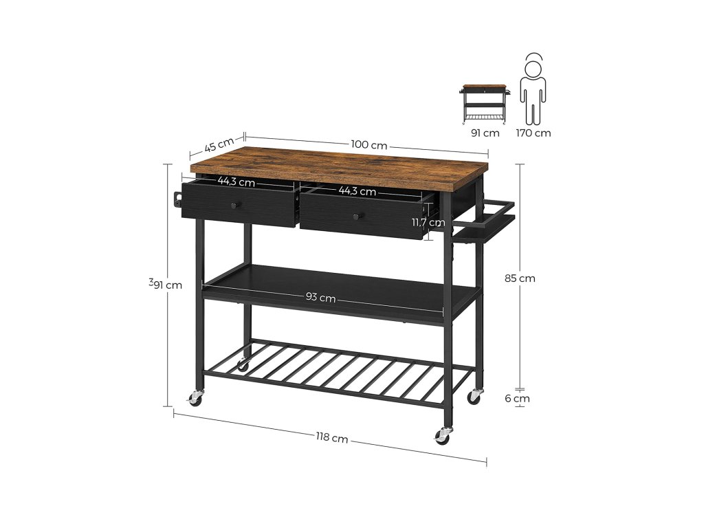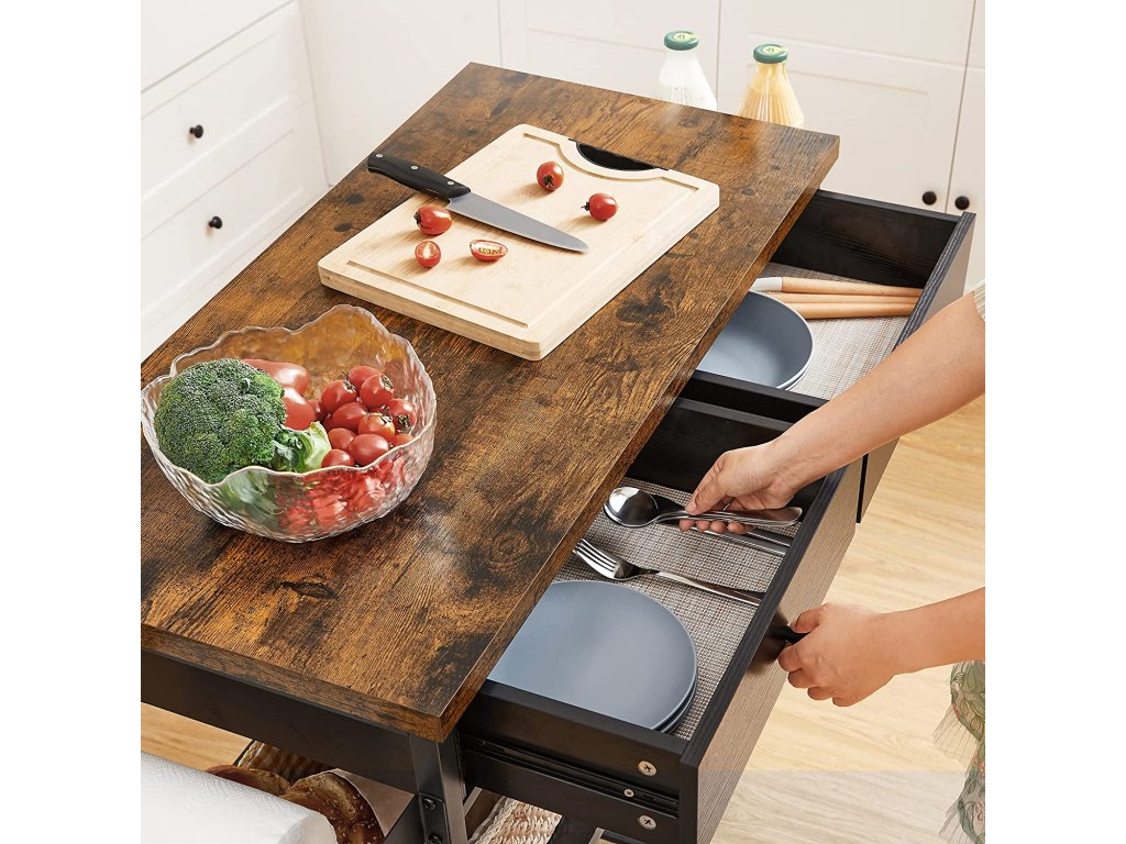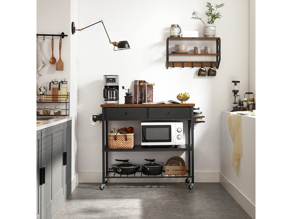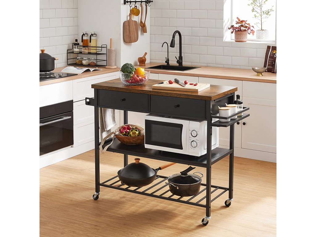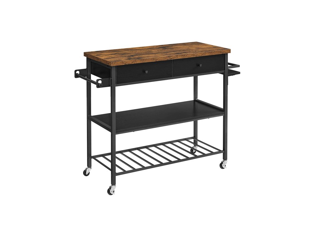 Kuchyňský regál, kuchyňský vozík, multifunkční regál, kuchyňský ostrůvek se 3 policemi a 2 zásuvkami, držák na ručníky, držák na koření, 119 x 45 x 91 cm, Vintage, hnědo-černý.