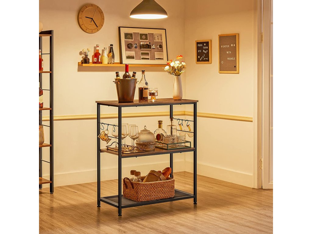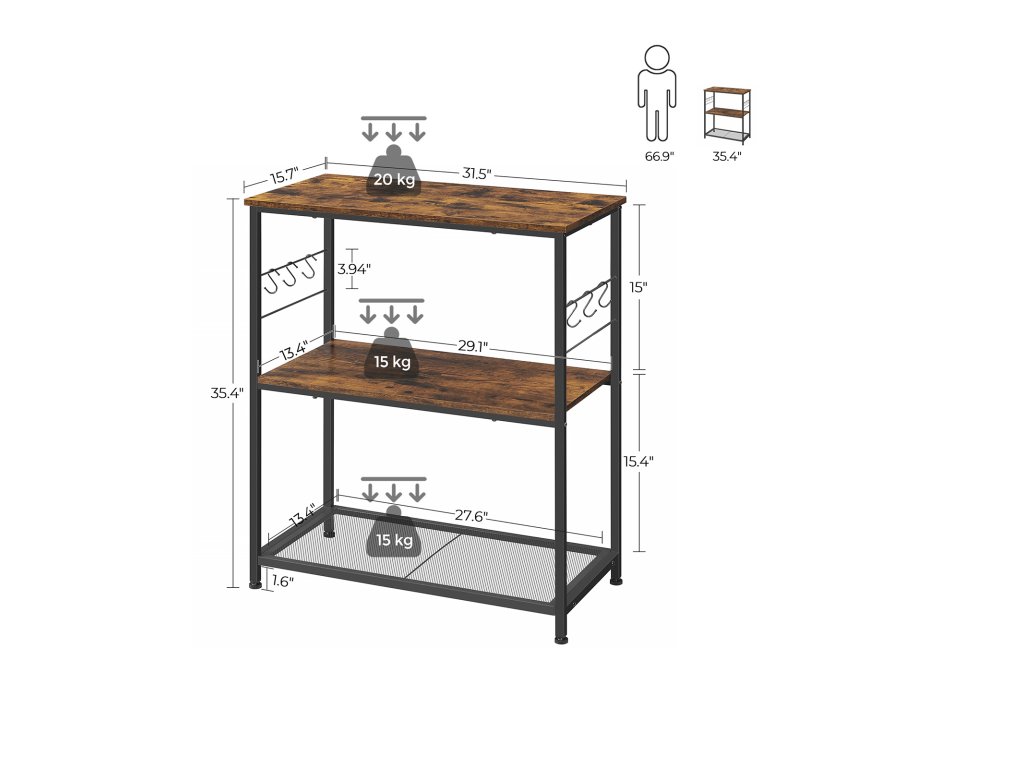 Oko jí s: jídlo by mělo nejen dobře chutnat, ale také krásně vypadat. Vintage hnědá dřevotříska, černý ocelový rám, síťovaná police - Tento kuchyňský regál ve vintage stylu dodá každému nádobí zvláštní kouzlo a rozzáří ho.VÍCE KUCHYŇSKÝCH POLEČEK - 3 police na mikrovlnnou troubu a toustovač, 6 háčků na lžíce a naběračky - Tento stojan vám poskytne dostatek prostoru pro uložení kuchyňského náčiní. Je čas prokázat své kuchařské umění!.