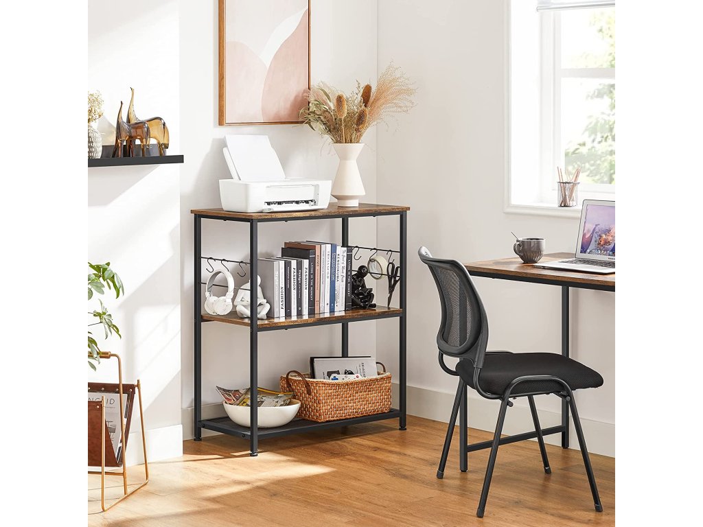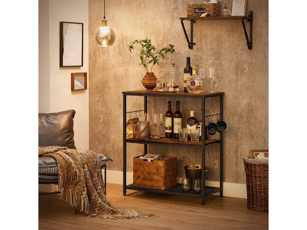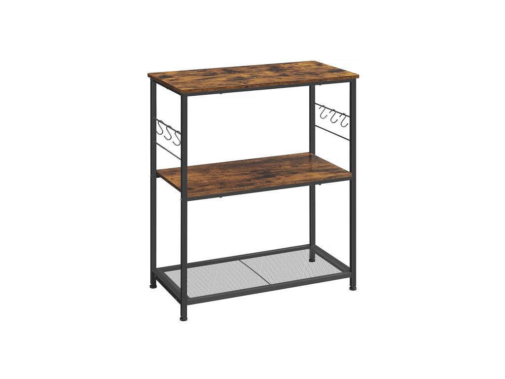 Kuchyňský regál, police na mikrovlnnou troubu, kuchyňský ostrov, stojící police, kovový rám, 3 police, otevřený, 6 háčků, multifunkční police, 80 x 40 x 90 cm, průmyslový design, vintage hnědá/černá.