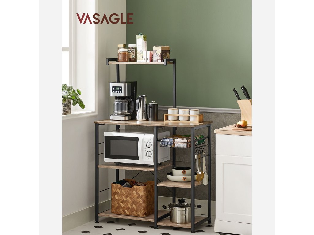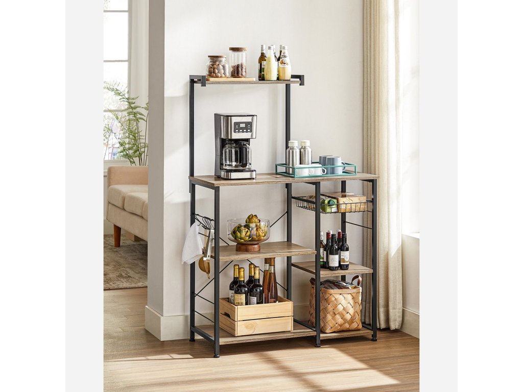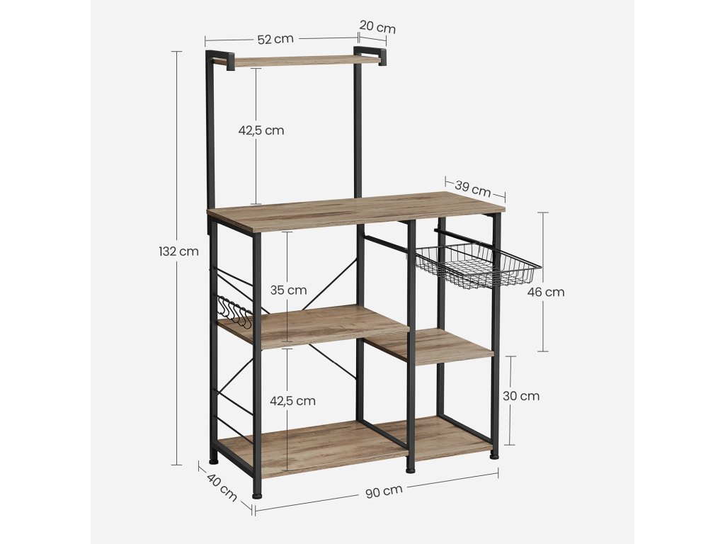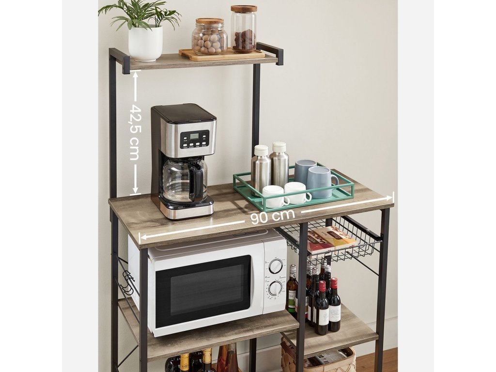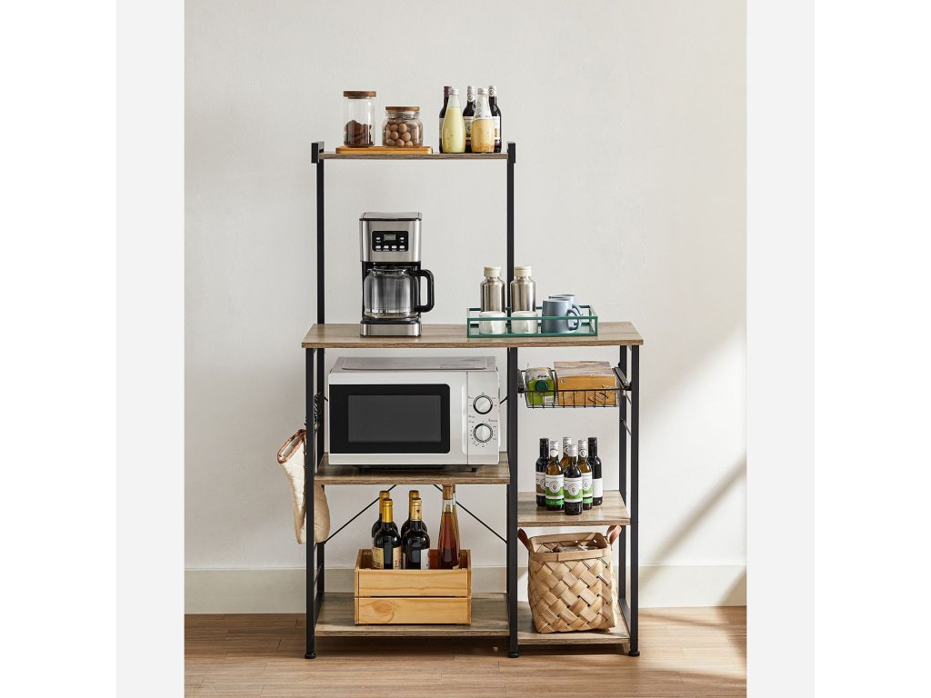 Úspora úložného prostoru: nemáte ve spíži více místa? Tato kuchyňská police je vám k dispozici. Je vybaven mnoha policemi, 6 S-háčky a drátěným košem a nabízí dostatek prostoru pro kuchyňské přísady, pánve, nápoje, koření, suché utěrky atd.ODOLNÁ STABILITA - Tento stojan do mikrovlnné trouby je vyroben z dřevotřískové desky a robustního ocelového rámu s tyčemi o rozměrech 20 x 20 mm a poskytuje pevný úchyt pro veškeré kuchyňské náčiní. Nastavitelné nožičky zajišťují, že police nestojí nakřivo ani na nerovné podlaze.