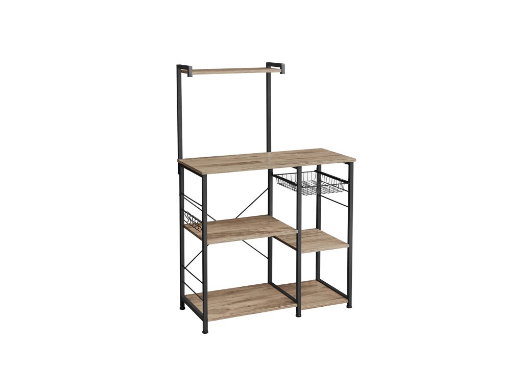 Kuchyňský regál, stojící regál s kovovým košem, pekařský regál se 6 S-háčky a policemi, police do mikrovlnné trouby, stojan na koření, na hrnce a pánve, průmyslový design, dub hnědý/černý.