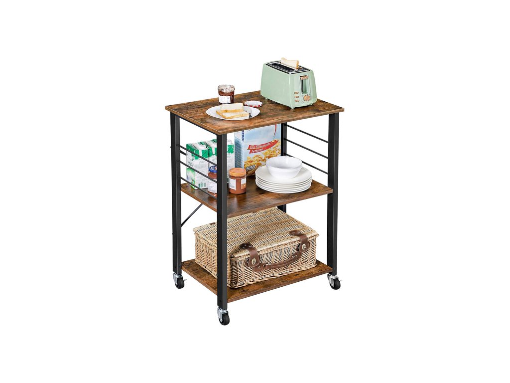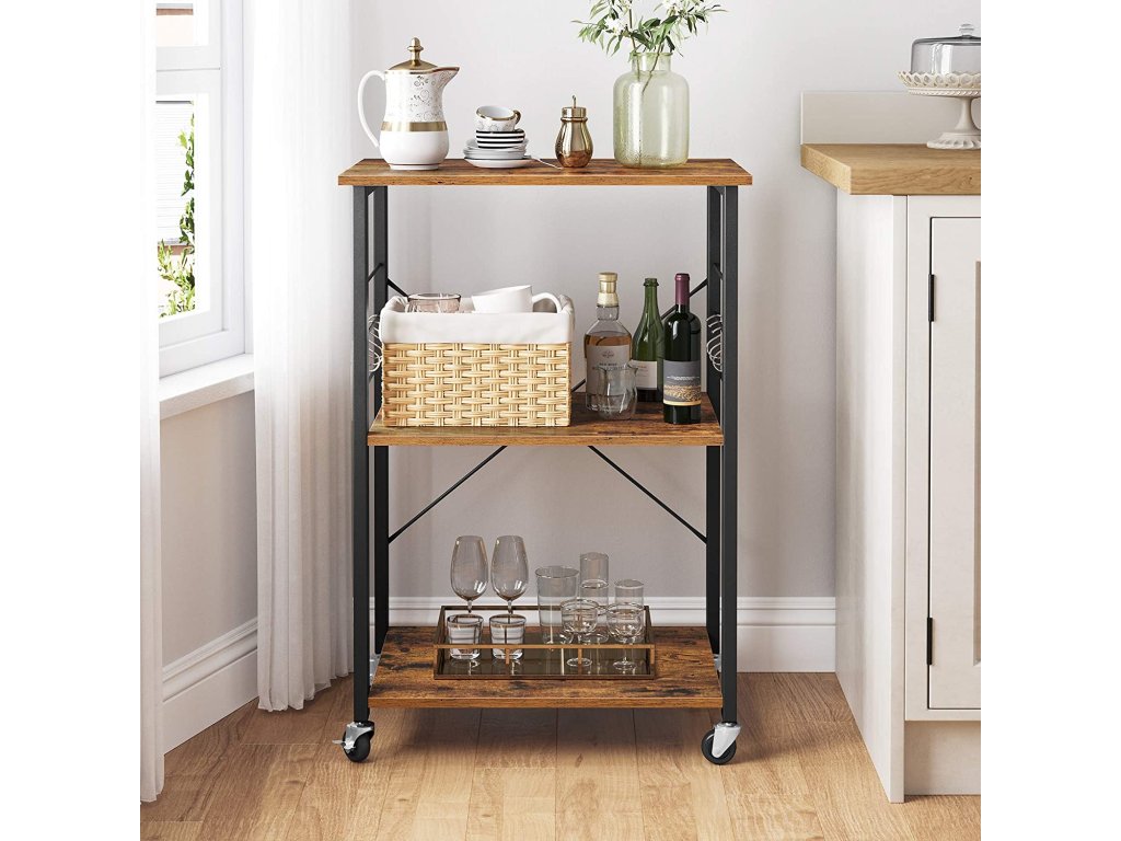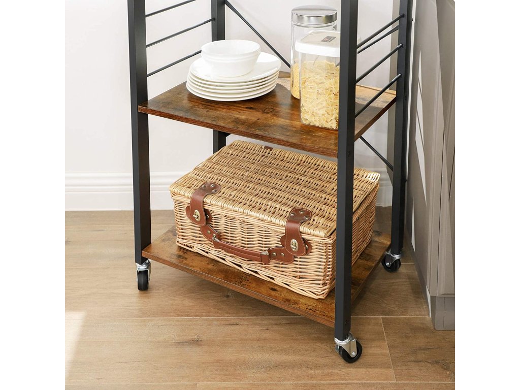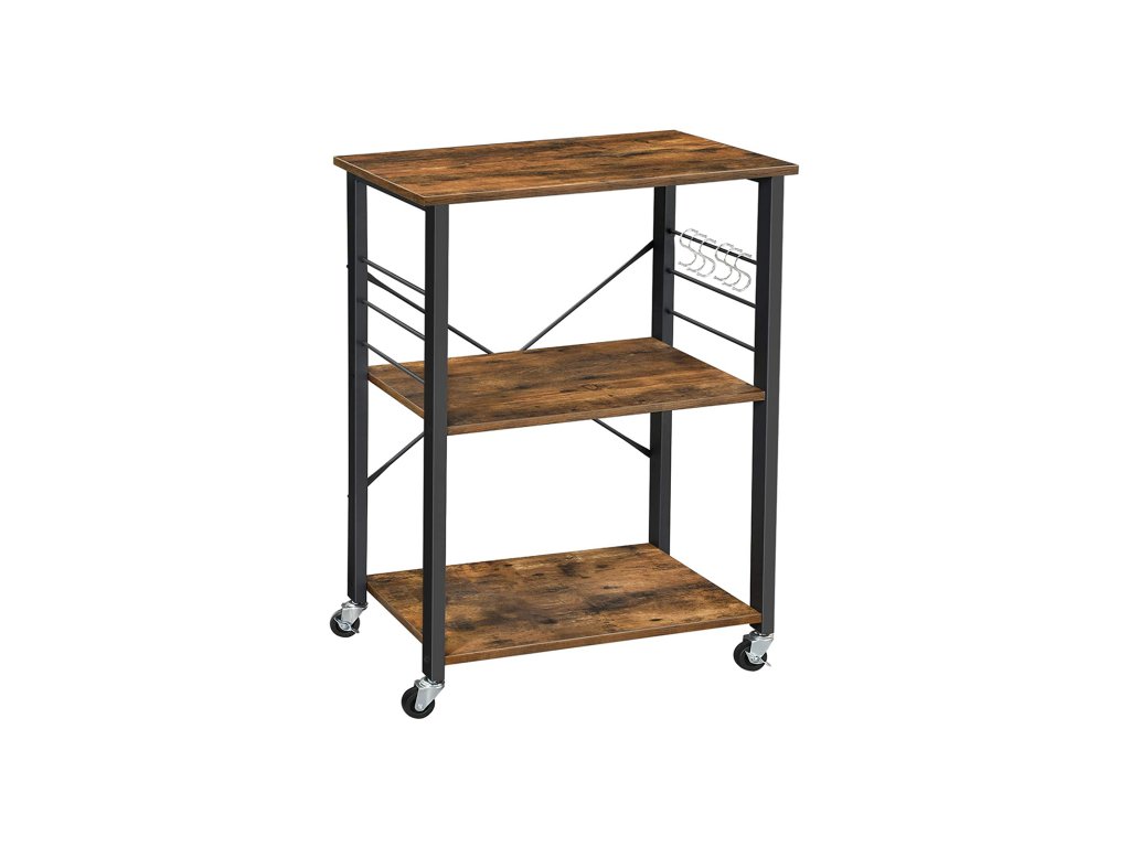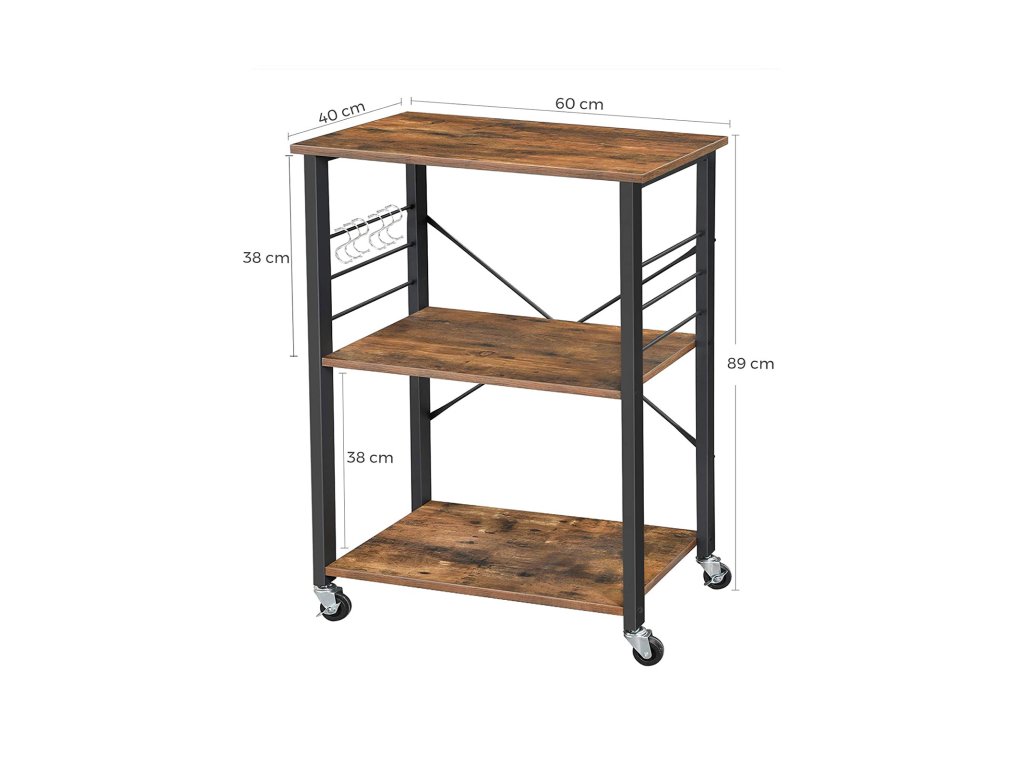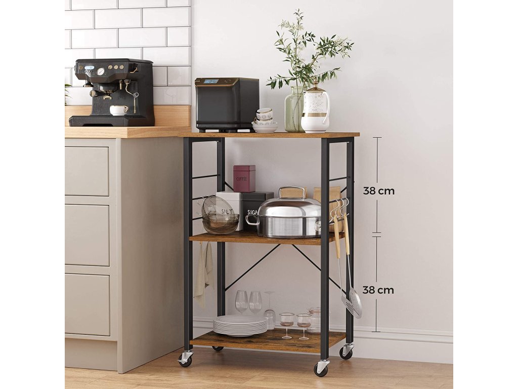 Kuchyňský regál na kolečkách, servírovací vozík se 3 policemi, police na mikrovlnnou troubu, na mini troubu, toustovač, kovový rám se 6 háčky, průmyslový design, rustikální hnědá.
