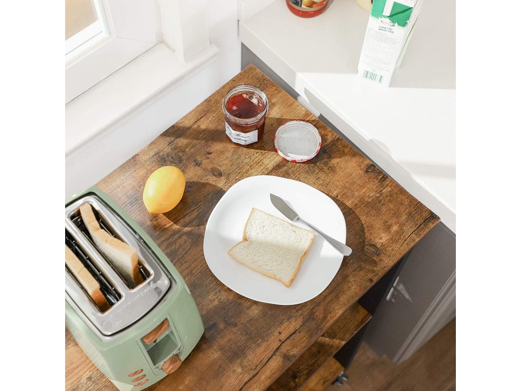 KOORDINÁTOR KUCHYŇSKÉHO CHAOSU: Pokud je třeba kvůli uvolnění místa přesunout topinkovače a rychlovarné konvice na podlahu, je nejvyšší čas pro tento kuchyňský regál s trojicí polic o rozměrech 54 x 37,5 cm. Mikrovlnnou troubu umístěte na horní úroveň.MOBILNÍ KUCHYNĚ: Tento vozík jezdí po kuchyni na 4 robustních kolečkách a poskytuje koření, oleje a omáčky přímo u sporáku. Zablokujte obě brzdy pojízdného vozíku, aby se zabránilo odvalování přísad.VŽDYCKY JE NĚKDE NĚJAKÝ HÁČEK, ŽE? Ano! Kromě police vám zašleme také 6 háčků ve tvaru S, které jsou ideální pro zavěšení lžic na vaření nebo suchých ručníků.