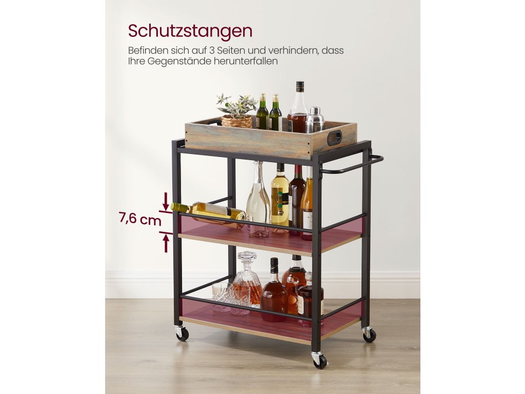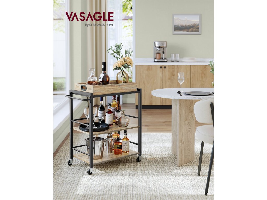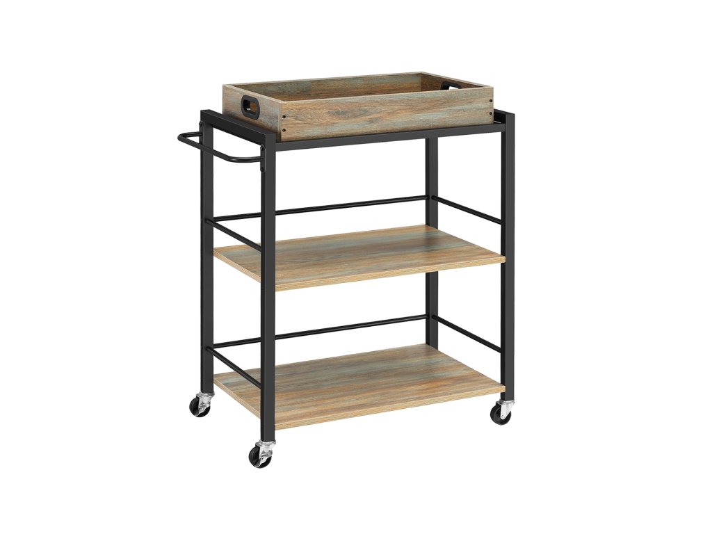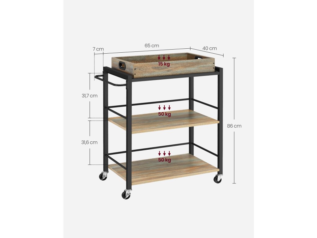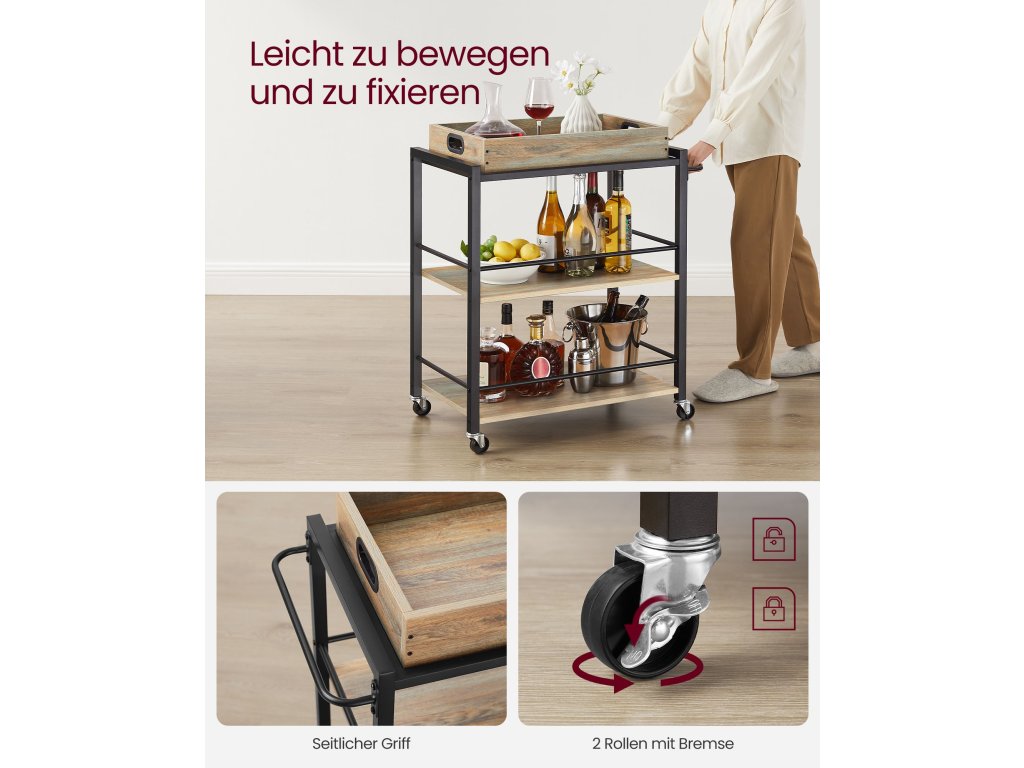 Stylové a funkční Vylepšete svou kuchyň, která je stejně okouzlující jako praktická; kombinace tyrkysově hnědé a inkoustově černé barvy dodává tomuto kuchyňskému vozíku s úložným prostorem jedinečný vzhled, kterým se budete chtít pochlubit při příští večeři;2 způsoby použití Vozík nebo police! Připevněte 4 kolečka, z nichž 2 jsou opatřena brzdami, a přesuňte kuchyňský vozík do obývacího pokoje, nebo použijte nastavitelné nožičky, aby kuchyňská police zůstala nehybná a stabilní v blízkosti sporáku; je to na vás!;Vyjímatelný a pohodlný podnos Zvedněte podnos bez námahy (unese až 15 kg) a vychutnejte si jídlo bez otravných drobků. Zvýšené okraje zajišťují čistotu a pořádek na lůžku, a tím zvyšují pohodlí při ranní rutině.Aperitivy, dezerty a šampaňské Začněte oslavu se vším, co potřebujete, na tomto vozíku! Tento kuchyňský vozík se může pochlubit 3 velkými policemi, robustním ocelovým rámem o rozměrech 25 x 25 mm. a celkovou nosností 60 kg, je zde dostatek místa pro vše.Co dostanete Vynikající kuchyňský vozík, pečlivě vyrobený z robustní dřevotřísky a pevného ocelového rámu. Ať se tento výjimečný vozík stane vaším spolehlivým společníkem v kuchyni!| Kategorie: | Servírovací stolky |